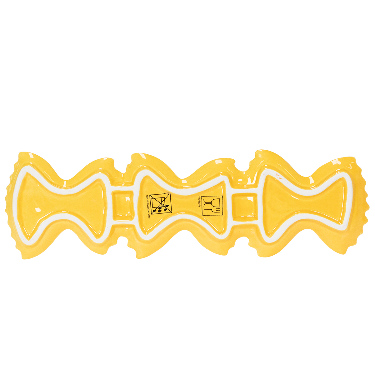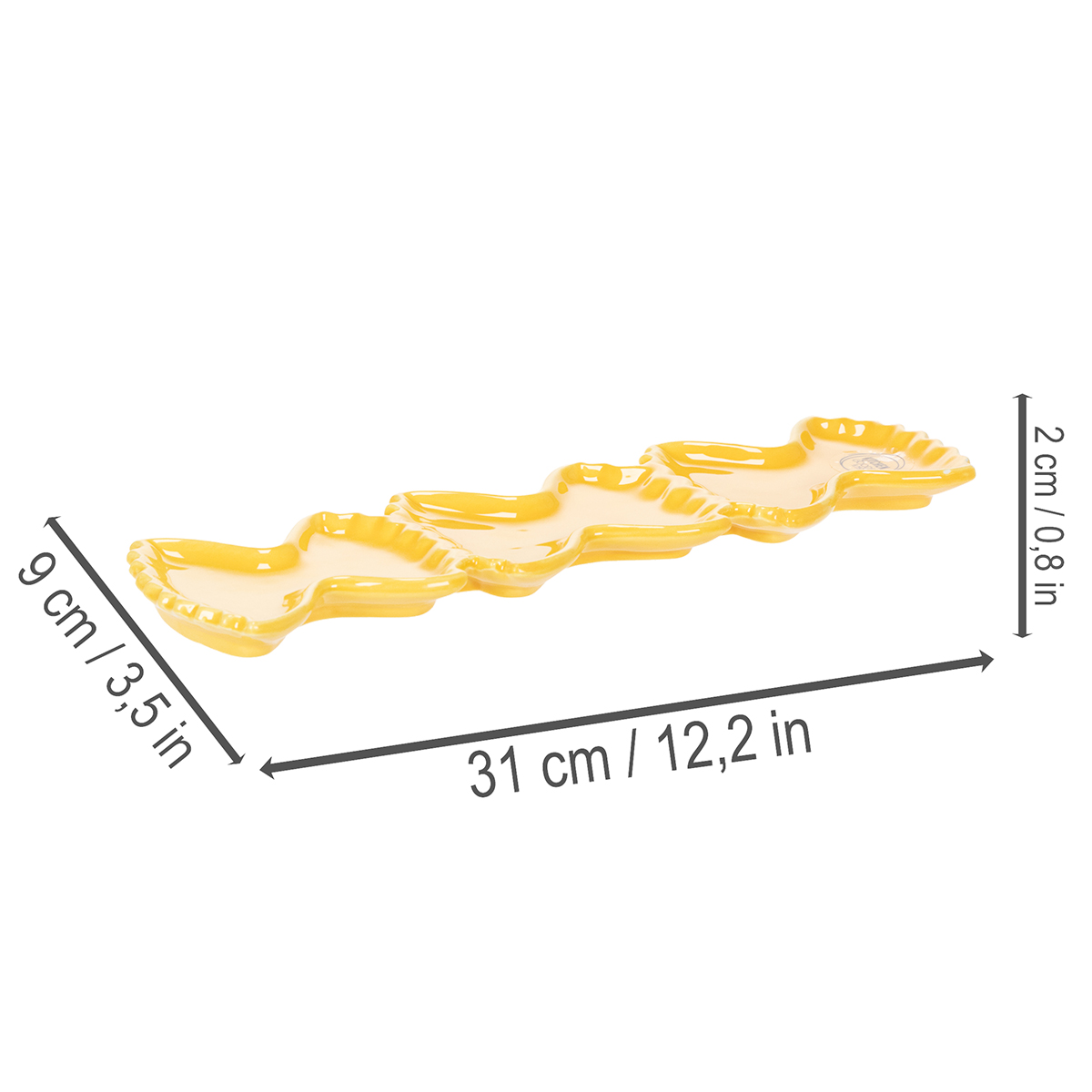 A 31 cm hosszú és 9 cm széles kerámia mártogatós tál bőséges helyet kínál kedvenc falatkáidnak. A tál játékos tésztaformája bájos karaktert kölcsönöz neki, és igazi tekinteteket gyönyörködtető látványt nyújt bármilyen asztalon. Más sárga kiegészítőkkel, például kollekciónk tésztavázáival kombinálva asztalod harmonikus műalkotássá válik, amely tökéletesen illik egy mediterrán vagy nyári stílushoz.