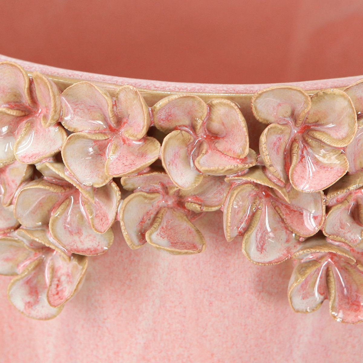Varázsoljon vintage bájt otthonába rózsaszín virágos peremű kerámia virágcserépünkkel. Tökéletes tavaszi és nyári dekorációhoz, ez a gyönyörű virágtartó egyedi mázas rózsaszín felülettel és részletgazdag virágperemekkel rendelkezik, amelyek finoman verik vissza a fényt. A szín elegánsan változik rózsaszínről órózsaszínre, amit finom zöldesbarna akcentusok szakítanak meg. A virágcserépen alkalmanként fehér akcentusok is láthatók. Ezek a finom árnyalatok a romantikus virágmintával együtt ideális elemévé teszik ezt a virágcserepet vintage vagy kopott, elegáns elrendezésekhez. A virágcserép alakja az aljához közel elkeskenyedik, hogy elegáns alapot hozzon létre a nagyobb stabilitás és stílus érdekében. Hagyja magát inspirálni ennek a dekorációs elemnek a szépségétől, hogy jellegzetes és stílusos módon díszítse lakóterét. A növénycserép tökéletes a nappaliba, asztaldísznek nyáron vagy tavasszal vagy stílusos ajándékötletnek.