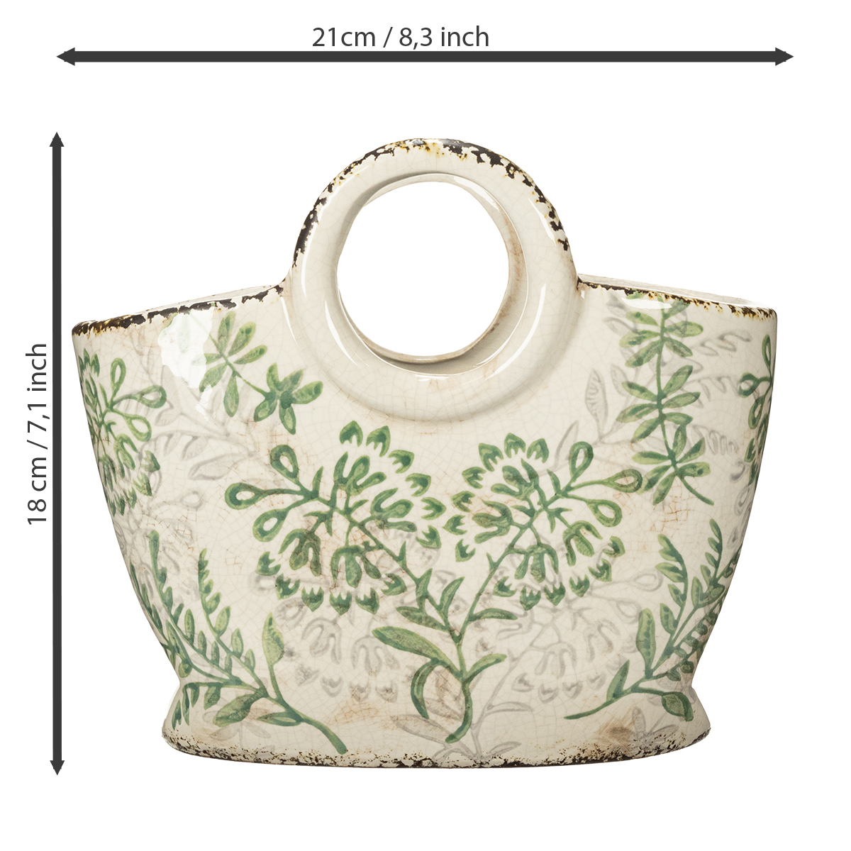 Ez a kézzel festett kerámia virágtartó nemcsak egyedi dizájnjának köszönhetően kiemelkedik a kínálatból, hanem kiváló minőségű kidolgozásával is lenyűgözi a látogatót. 21 cm hosszú, 13 cm széles és 18 cm magas, így bőséges helyet kínál a földnek és a növényeknek. Lágy fehér és zöld színvilága nyugtató és harmonikus hangulatot teremt, így tökéletes olyan virágokhoz, mint a színes muskátlik, vagy olyan finom fűszernövényekhez, mint a bazsalikom és a kakukkfű.