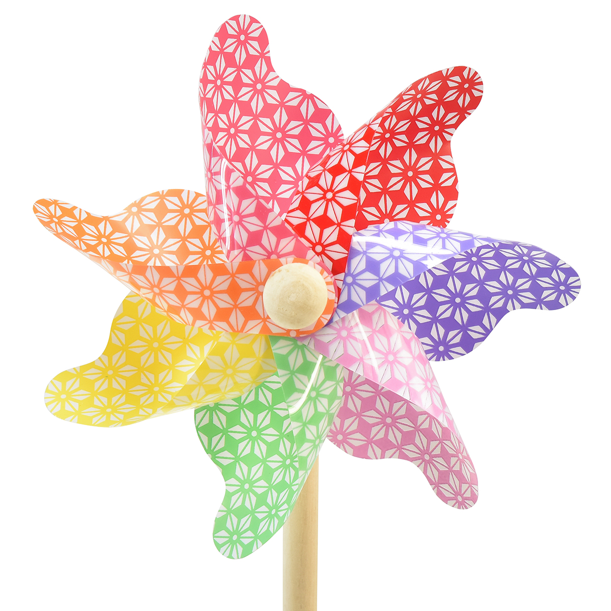 A pálcán lévő színes szélmalmot fehér színben kockák és virágok keverékéből készült minta díszíti. Minden levél más színű, míg a keret világos fából készült. Két arany színű fémszegecs tartja formában a szélturbinát. A narancssárga, sárga, zöld, rózsaszín, piros és lila színekben a szélturbina színt visz az ágyásokba és virágládákba.