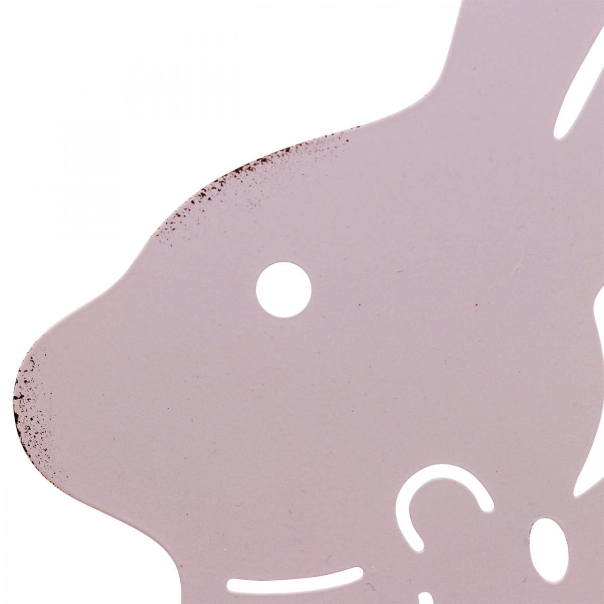 Szúrós fülekkel a nyúl egyenesen ül a dugóként szolgáló két pálcán. A lila meleg színe és a puha, sima élek azt a benyomást keltik, hogy a felhasznált anyag valami más, mint a hidegnek nevezett fém. Ezenkívül a nyuszi sziluett masni alakú kivágást tartalmaz a nyuszi nyakánál. Szép nagy masni, még a szalagok is művészien íveltek a húsvéti díszeken. A nyakat is apró, enyhén ívelt barázdák követik. Gyönyörű, békés összkép a húsvéti ágyra!