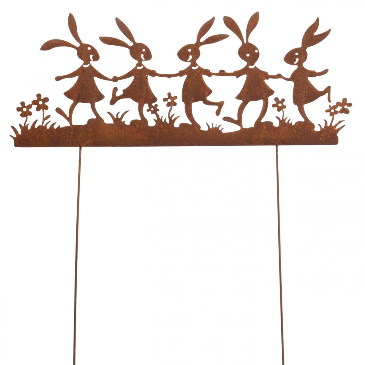 Öt nyúl nyitja meg a húsvéti tavaszi táncot ezen a fém virágdugón. A rozsdás kerti karó rusztikus bájt kölcsönöz húsvéti dekorációinak.A kültérre szánt virágdugó használható ágydíszként, vagy húsvéti dekorációként ültetésben vödörbe vagy virágkosárba. A bejárati rész vagy a kirakat nagyobb elrendezései is csodálatosan díszíthetők a rozsdadekorú kerti karóval.