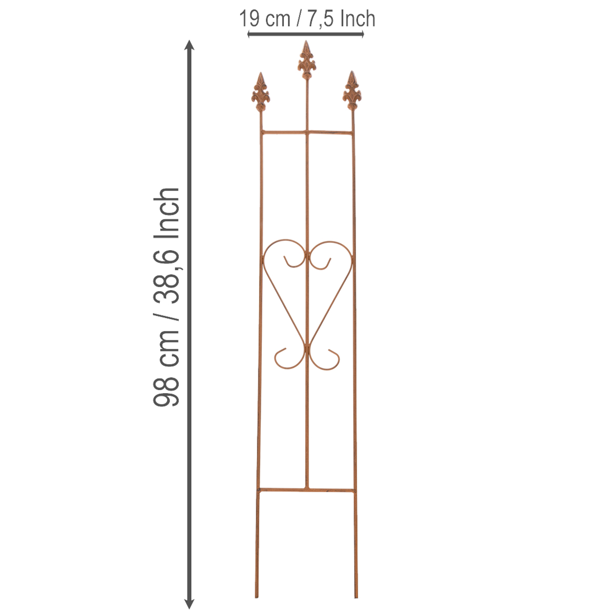 Tegye kertjébe egy csipetnyi bájt dekoratív, szív alakú kerti rácsunkkal! Képzelje el, ahogy futórózsák, borostyán vagy más futónövények elegánsan felkússzanak erre a finoman kidolgozott fémrácsra. A varázslatos, kopott fémfelület és a szív alakja igazi tekintetgyönyörködtetővé teszi ezt a darabot, akár egy kerti ösvény mentén, egy virágágyás közepén, akár erkélye díszeként helyezi el. Kiváló minőségű, robusztus fémből készült, ideális védett kültéri területekre, és stabil támaszt nyújt futónövényeinek. 98 centiméter magas és 19 centiméter széles, így tökéletesen illeszkedik virágládákba, nagyobb virágágyásokba vagy házfalakhoz.
