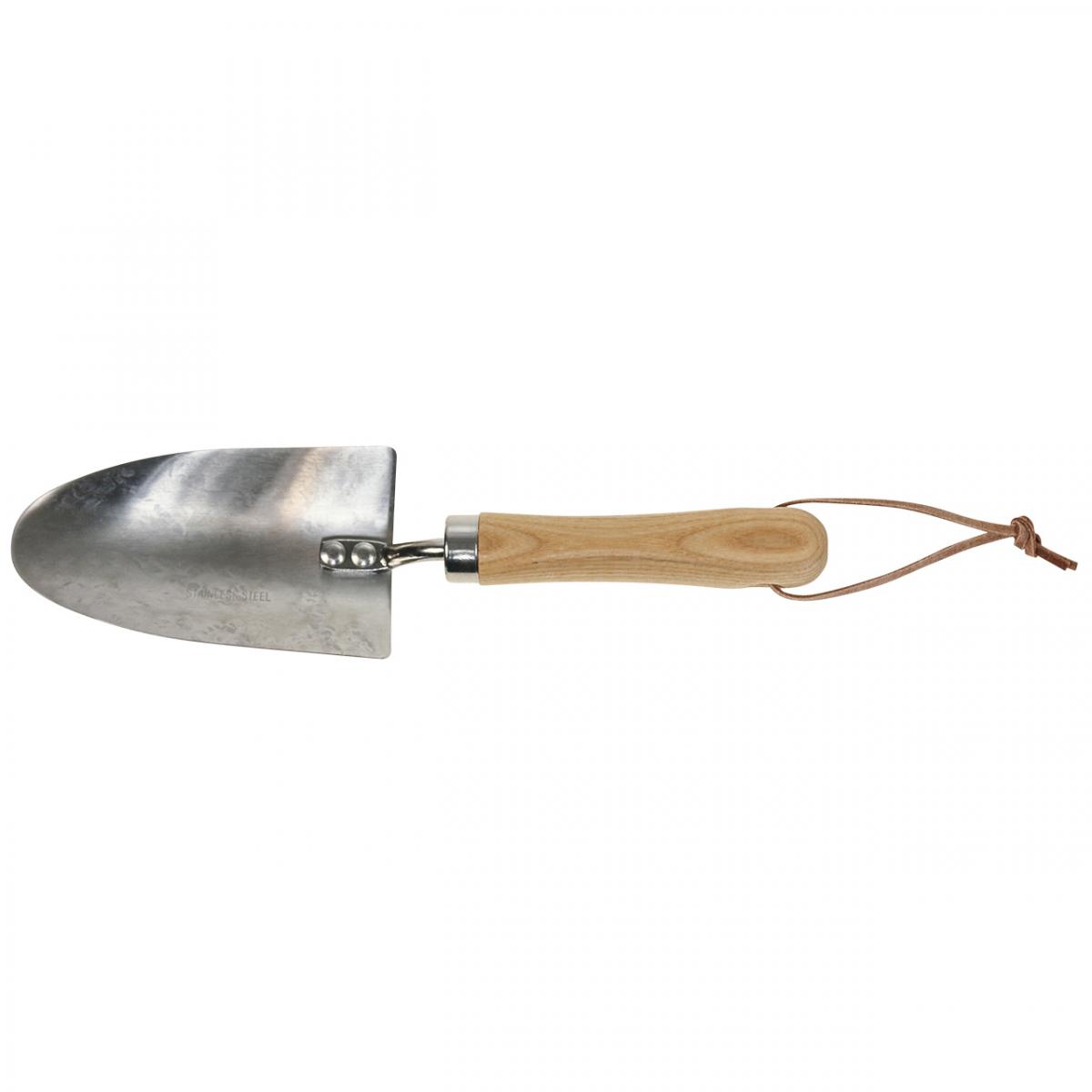 Ezzel a lapáttal könnyű a kertészkedés. Az ültető simító fa nyele különösen jól illeszkedik a kézbe a talajban végzett munka során. A fogantyúhoz elegáns műbőr szíj csatlakozik, hogy a kerti lapát a csuklóján maradjon, ha leejtené. A kis lapátot horogra vagy a kertben lévő szerszámpadra is felakaszthatjuk a szíjjal.