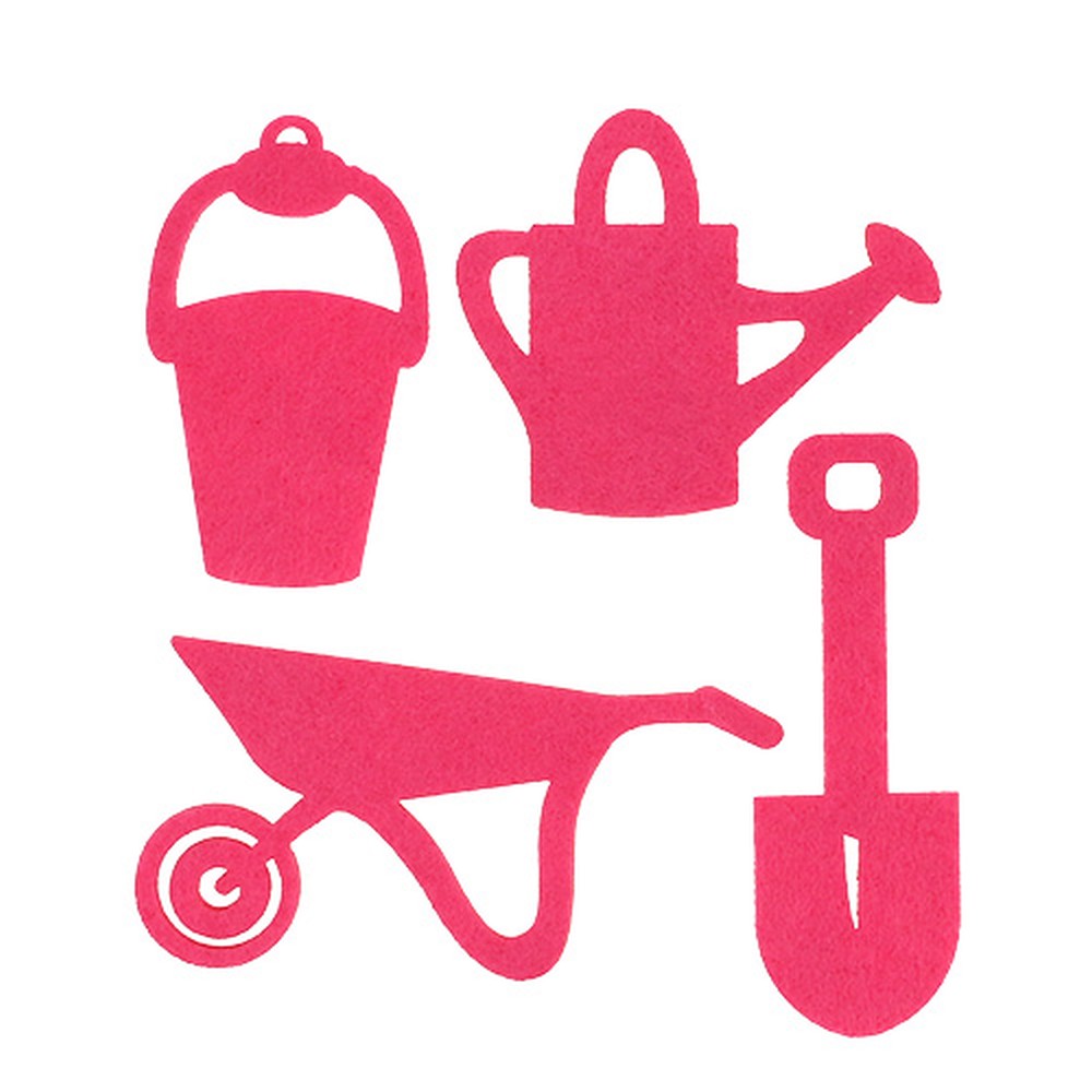 A nemezből készült, rózsaszínű kerti szerszámokat 24 darabos tasakban szállítjuk, egy változathoz 6 darab tartozik. A méretek változóak, így az öntözőkanna 7,5, a vödör 9, az ásó és a talicska pedig 12 centiméter körüli.