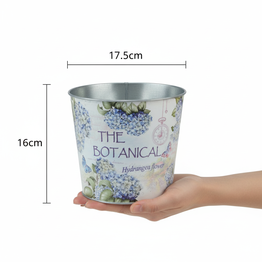 Ez a fém virágcserép nyári nosztalgiával teli. A hortenzia motívum díszíti ezt a csodálatosan sokoldalú tárolóedényt virágok és cserepes növények számára, és tökéletes ajándékötleteknek is.