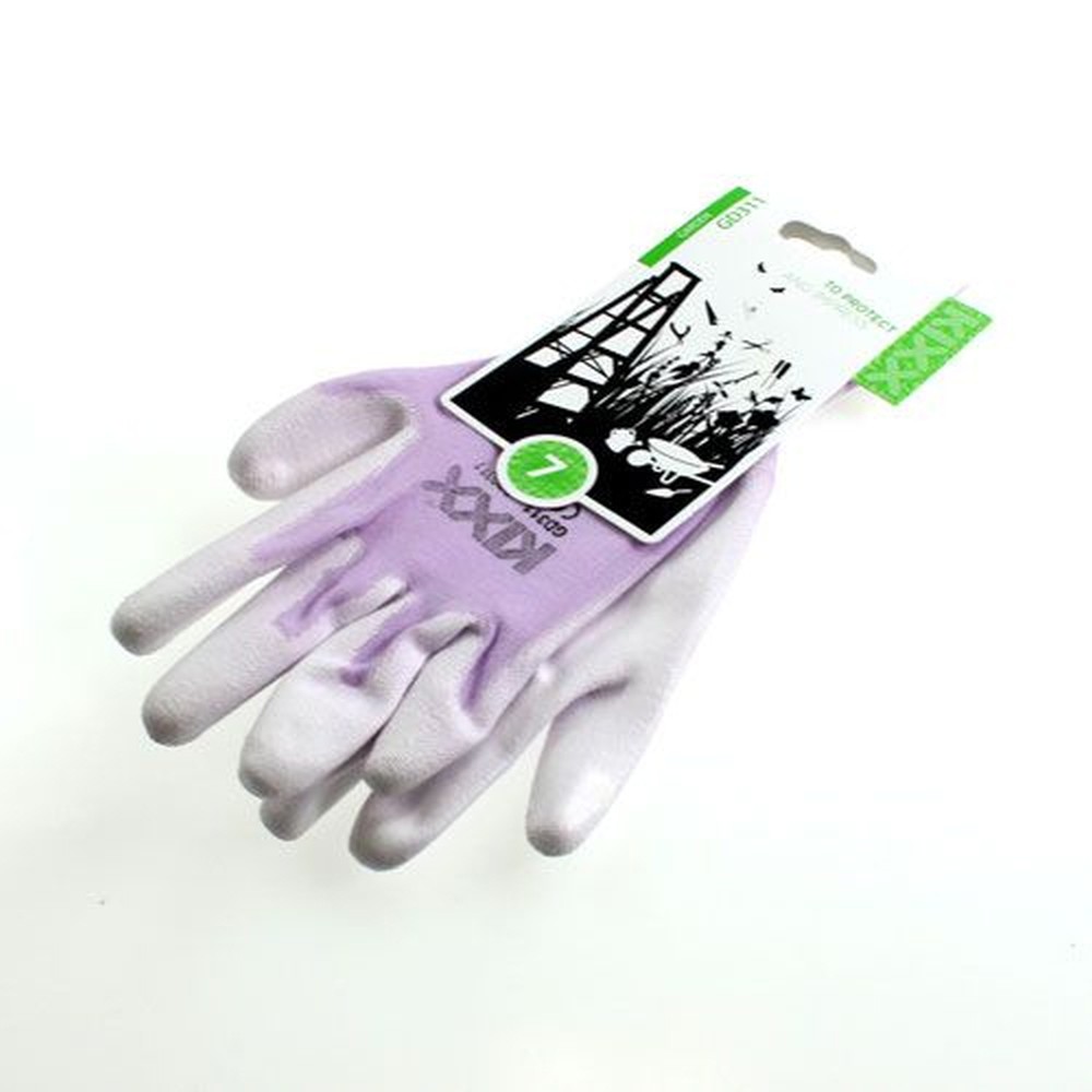 A fehér és lila színű Kixx® kertészeti kesztyűk 8-as méretűek, és védenek a kisebb kockázatoktól, de nagyon kopásállóak és különösen szakadásállóak. A védőkesztyűket mindig száraz kefével tisztítsa meg, és csak száraz, fénytől védett helyen tárolja.