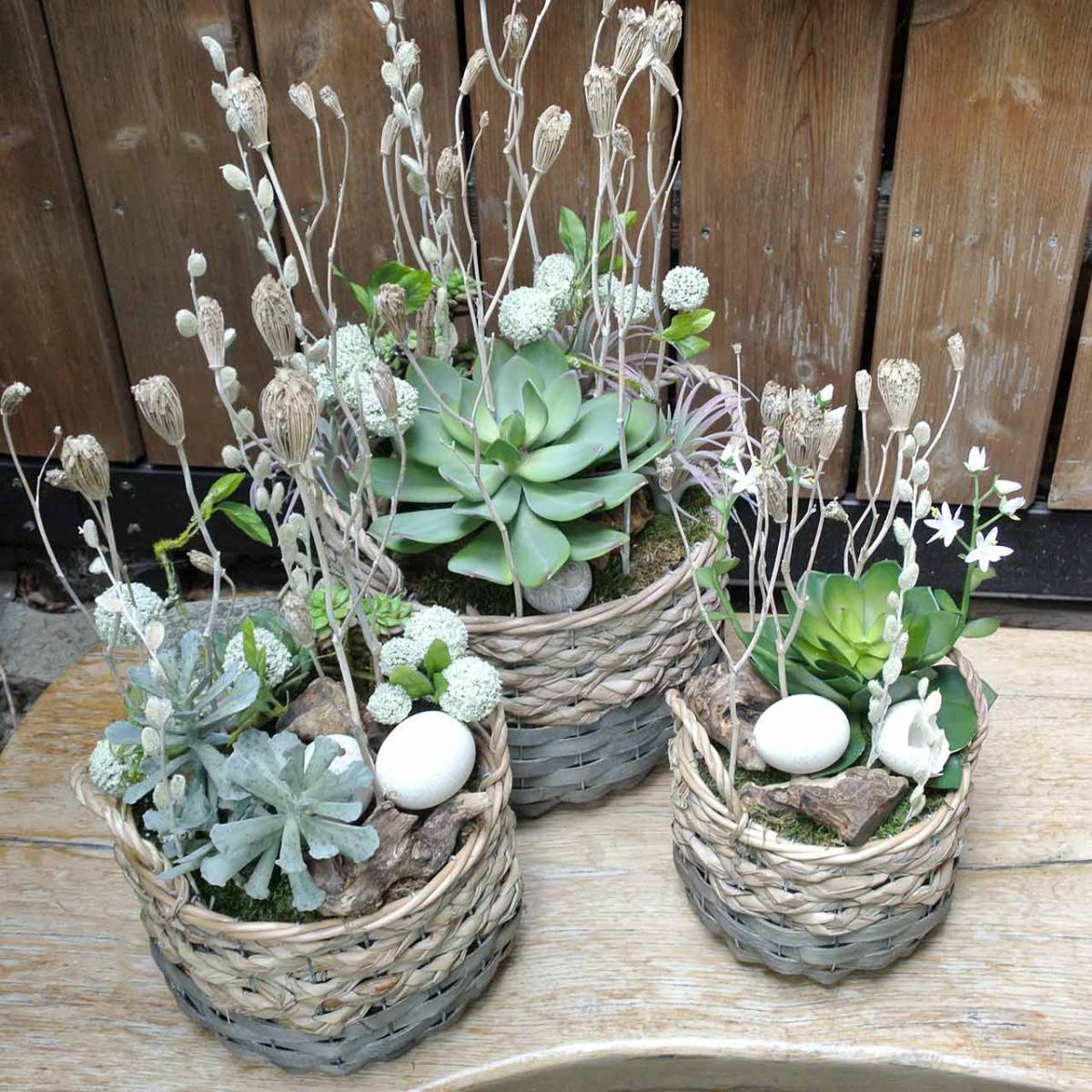 A fa és fű izgalmas keverékének köszönhetően a fonott kosár nem csak az ablakpárkányon hívja fel magára a figyelmet. A növénykosarak duójával asztaldíszként is hatást kelthetsz. A tavaszi virágoktól az őszi díszekig minden kis növény otthon érzi magát az ovális ültetőben. A vízi jácint modern, távol-keleti hatást kölcsönöz ennek a szokatlan fonottnak. Ezért nagyon alkalmasak bonsai készítésére is.