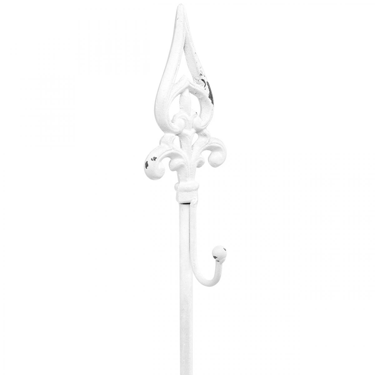 A fehér koszorútartó kopott eleganciát kölcsönöz dekoratív koszorúinak! Az öntöttvas fémdísznek nehéz talpa van, hogy az állvány ne boruljon fel, oldalsó kampó a koszorú felakasztásához és stilizált liliom alakú hegy. A fém állványt először barnára, majd fehérre festették. Végül a koszorúállványról helyenként eltávolították a fehér festéket, ami a dekorációs állvány jellegzetes vintage megjelenését adja.