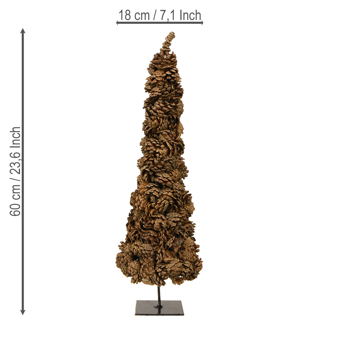 Kiváló minőségű fenyőtobozokból, fából, valamint finom fém és szövet részletekből készült, ez a toboz alakú karácsonyfa igazi tekinteteket gyönyörködtető. Körülbelül 60 cm magas és 16 cm átmérőjű, így elég kompakt ahhoz, hogy még kis helyeken is elférjen. Ideális asztalokra, tálalószekrényekre és ablakpárkányokra!