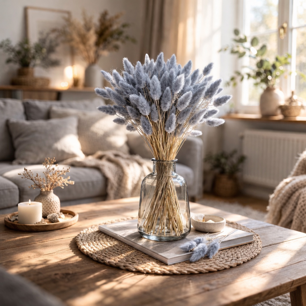 - Természetes dekoráció skandináv stílusban: Kombinálja a nyúlfarkfűvet világos faárnyalatokkal és minimalista kiegészítőkkel.