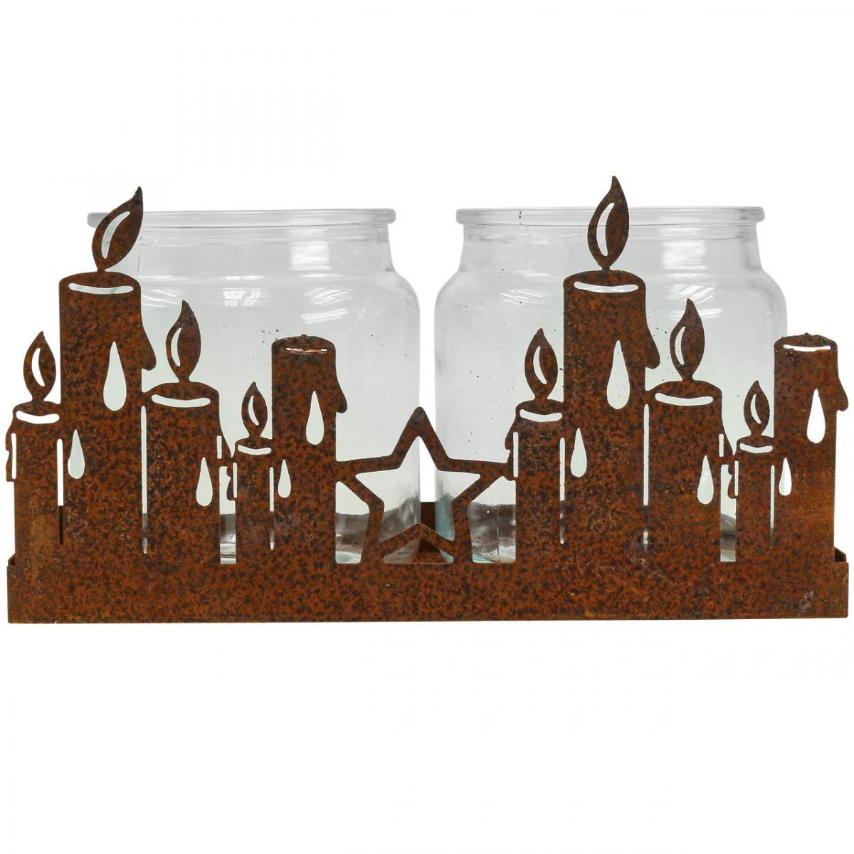 A fémtálcán, amelyen a két lámpás pohár áll, három alacsony széle és egy magas, dekoratív gyertya sziluettje van az elején.