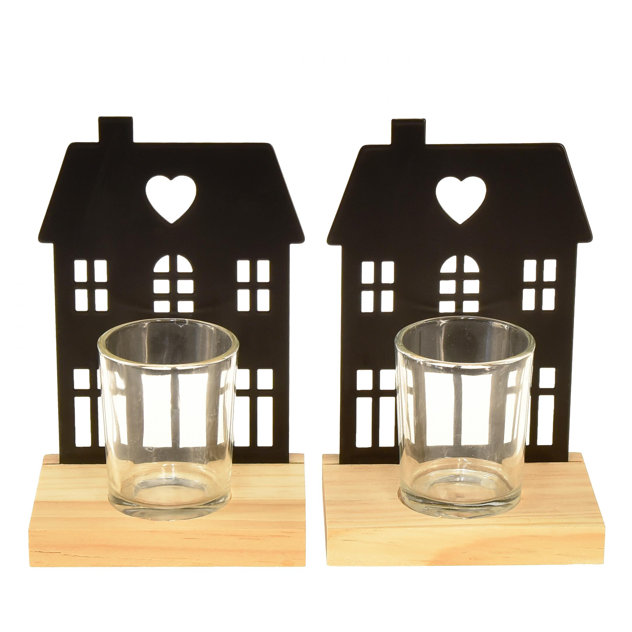 Lámpás ház fém fekete fa talppal H15cm 2db