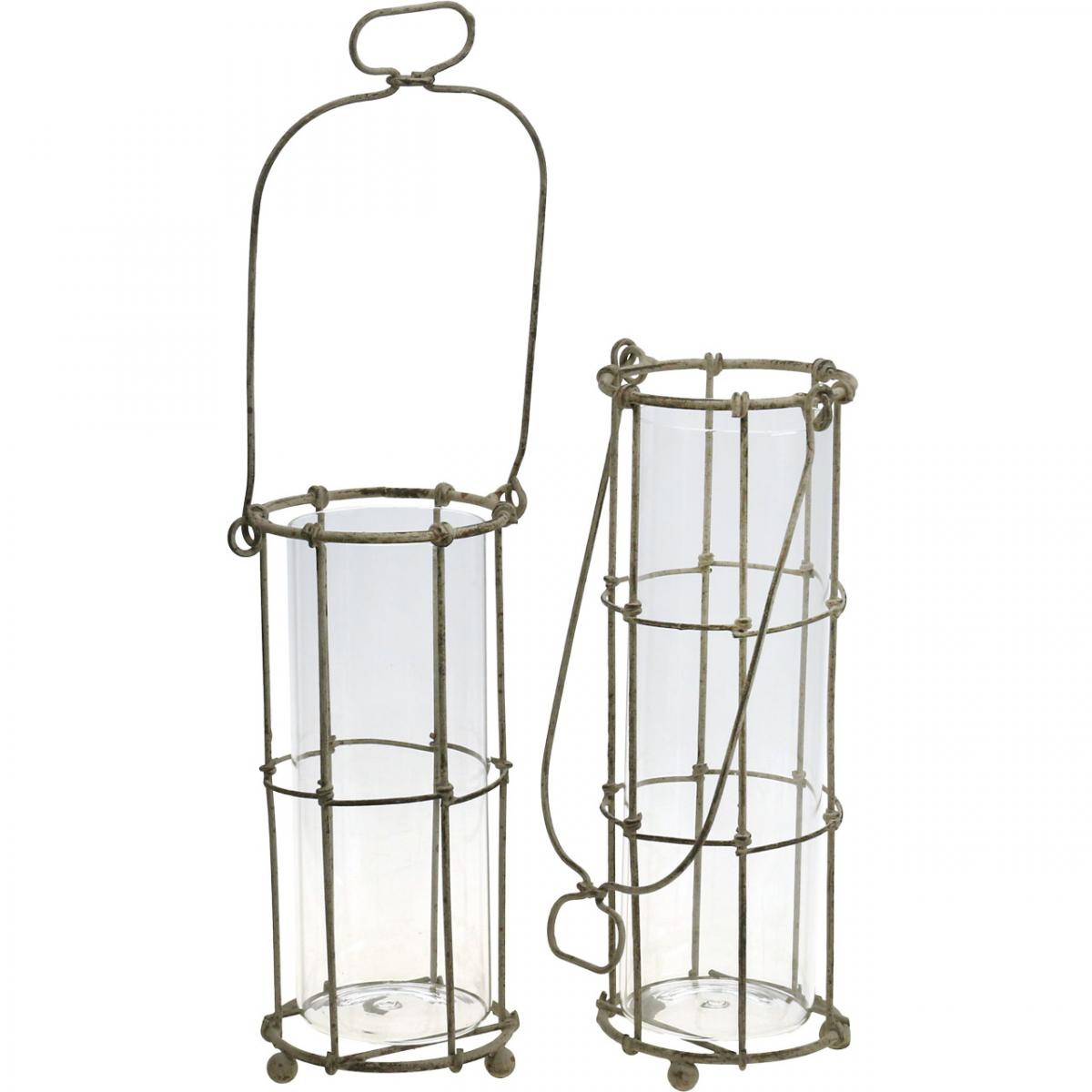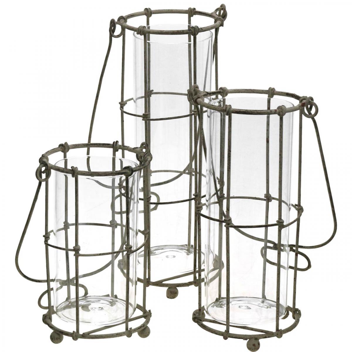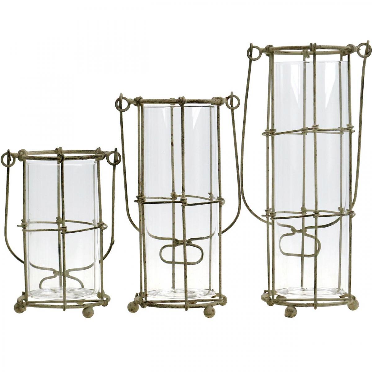 A három különböző méretű, üvegbetétes fém lámpás készlet beltéren és kertben egyaránt használható asztali díszként vagy függő dekorációként. A fém és üveg lámpásokat helyezze el egymás mellé egy bankettasztalon vagy az ablakpárkányon. Az üveglámpás betétet megtöltheti vízzel, és eredeti virágvázaként használhatja.