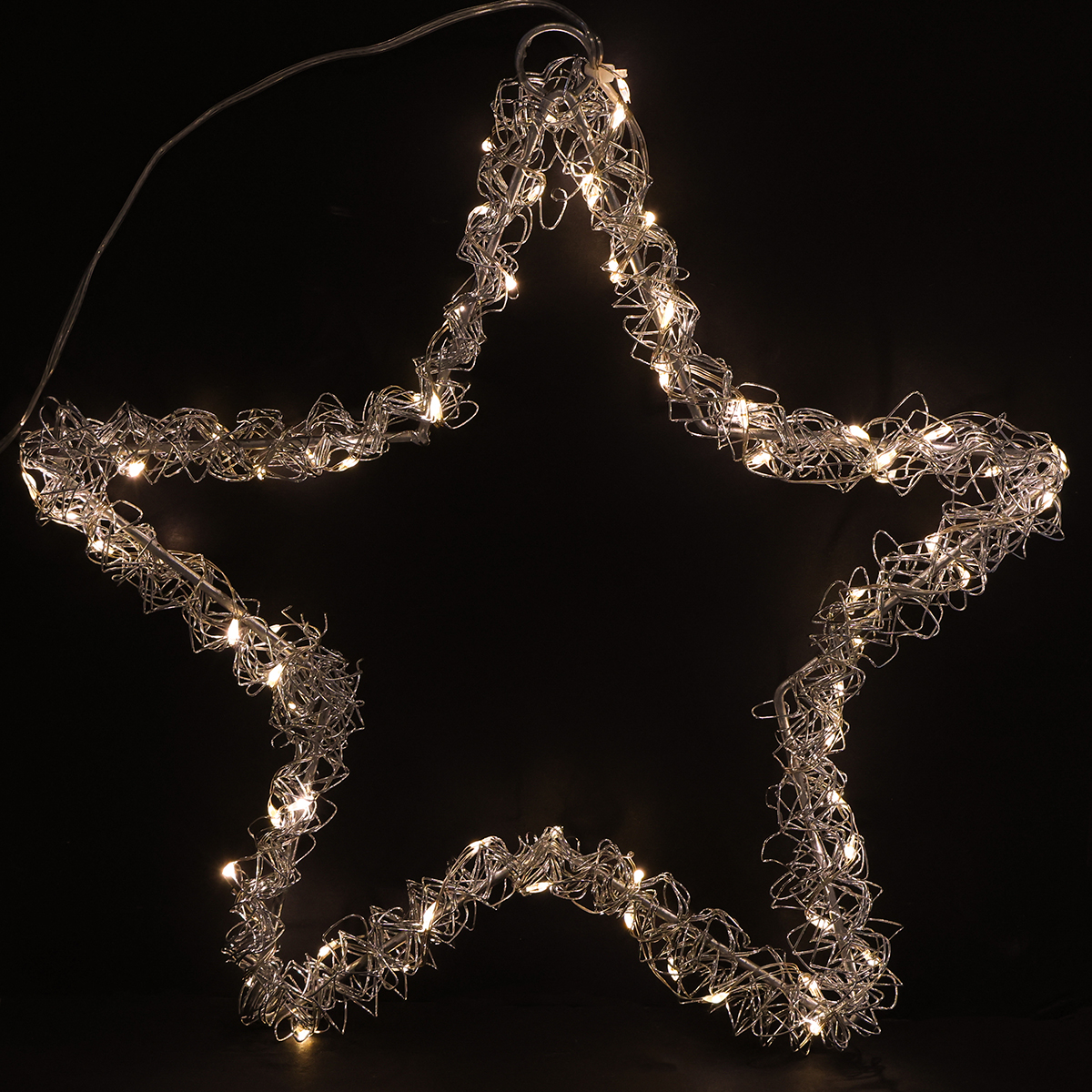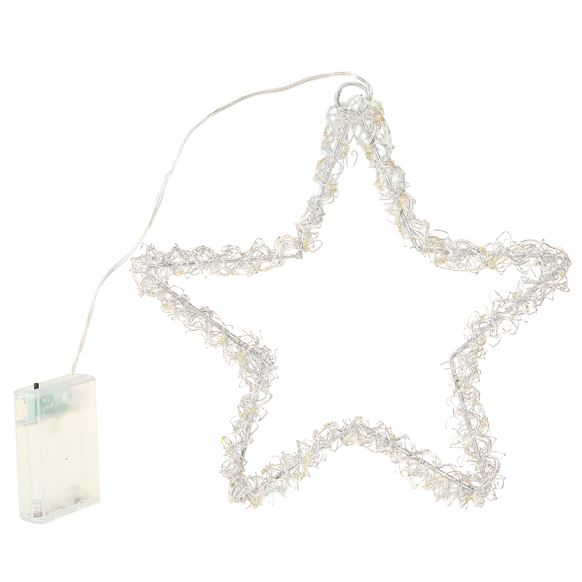 Az ezüst csillag összesen 70 kis LED-del világít. Az elemtartó rekesz a fém akasztófülhöz van rögzítve. Ha a fémcsillagot egy nejlonszálhoz rögzíted az ablakban, szinte úgy tűnik, mintha lebegne.