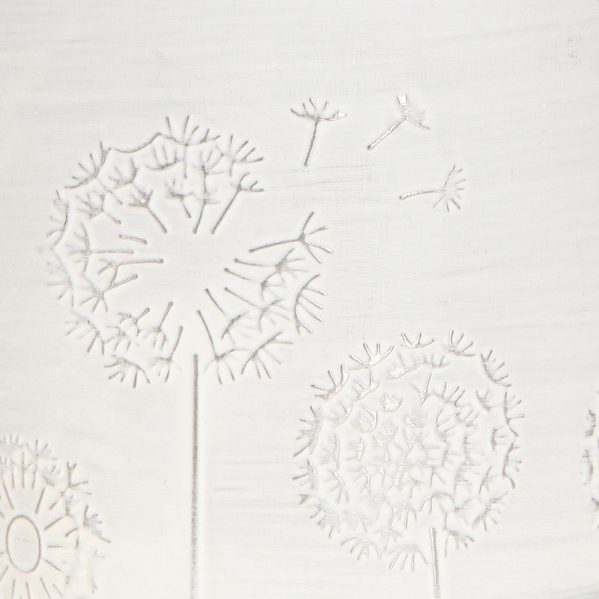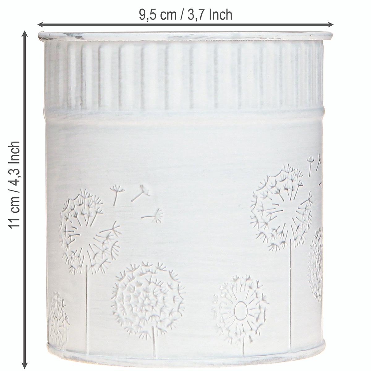 A kis virágcserép nosztalgikusan fehérre meszelt, belül ezüstre horganyzott és gyönyörűen díszített különféle pitypangok dombornyomott motívumával.