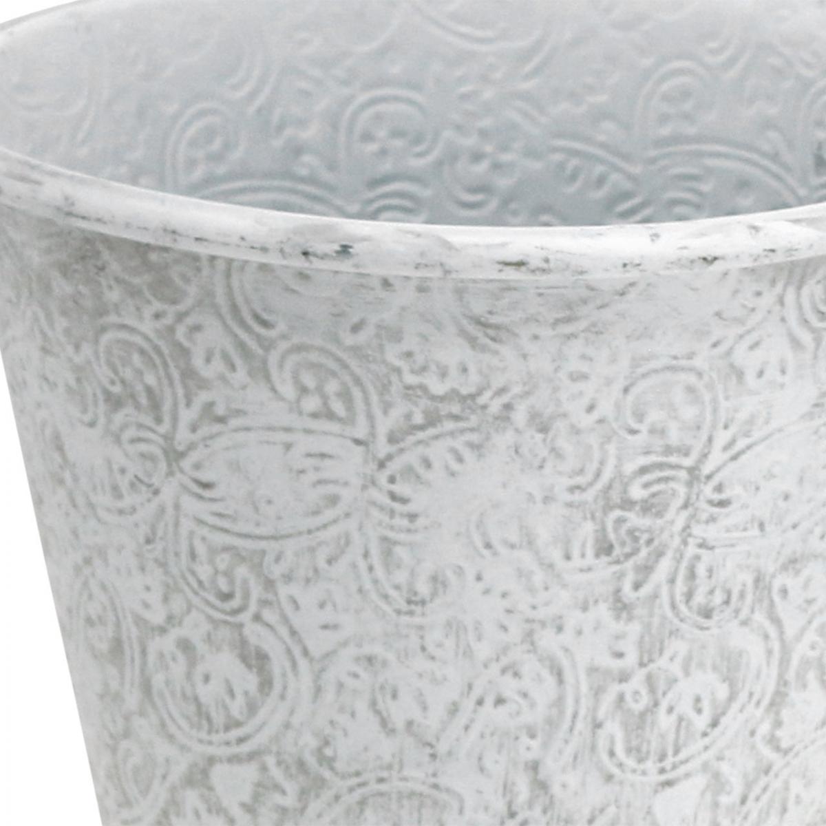 A meseszerű cachepot díszekkel díszítették: A fémdekorációt körös-körül virágos virágok domborítják. Romantikus megjelenésével és divatos kopott sikkes fehér mosásával a fémedény remekül illik vintage stílusú asztaldíszként esküvői virágdíszhez is!