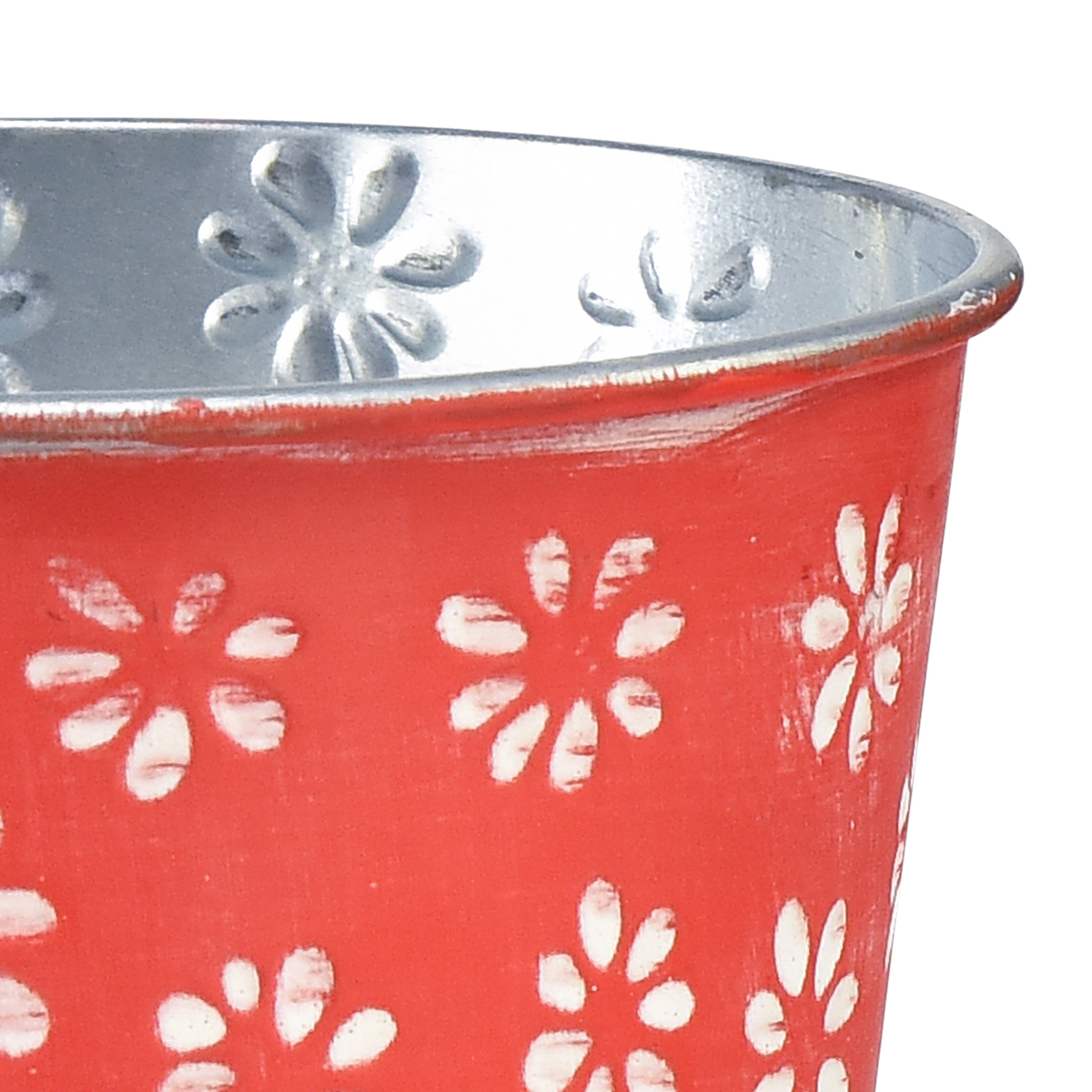 A virágok dombornyomásúak a cserépben és fehérre festettek. Az epervörös szín az ültetvényen enyhén elmosódottnak tűnik, kissé elmosódott vintage megjelenést kölcsönözve a motívumnak. A kis vödör belseje viszont ezüst marad, ami megfelel a horganyzott fém természetes színének.
