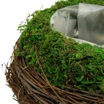 Eredeti formájú növénytálak, mohából és szőlőből készült növényszívek sírdíszítéshez virágos növényekkel