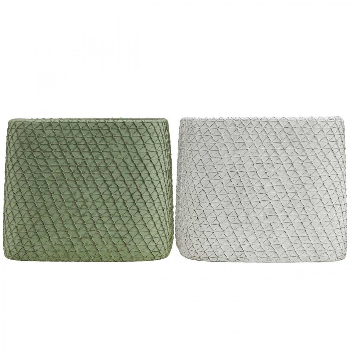 Az egyik virágcserép lágyzöld, a másik fehér kerámiából készült. A speciális hálós domborművel és az enyhén elvékonyodó formával a cachepotok jól illeszkednek a modern környezetbe.
