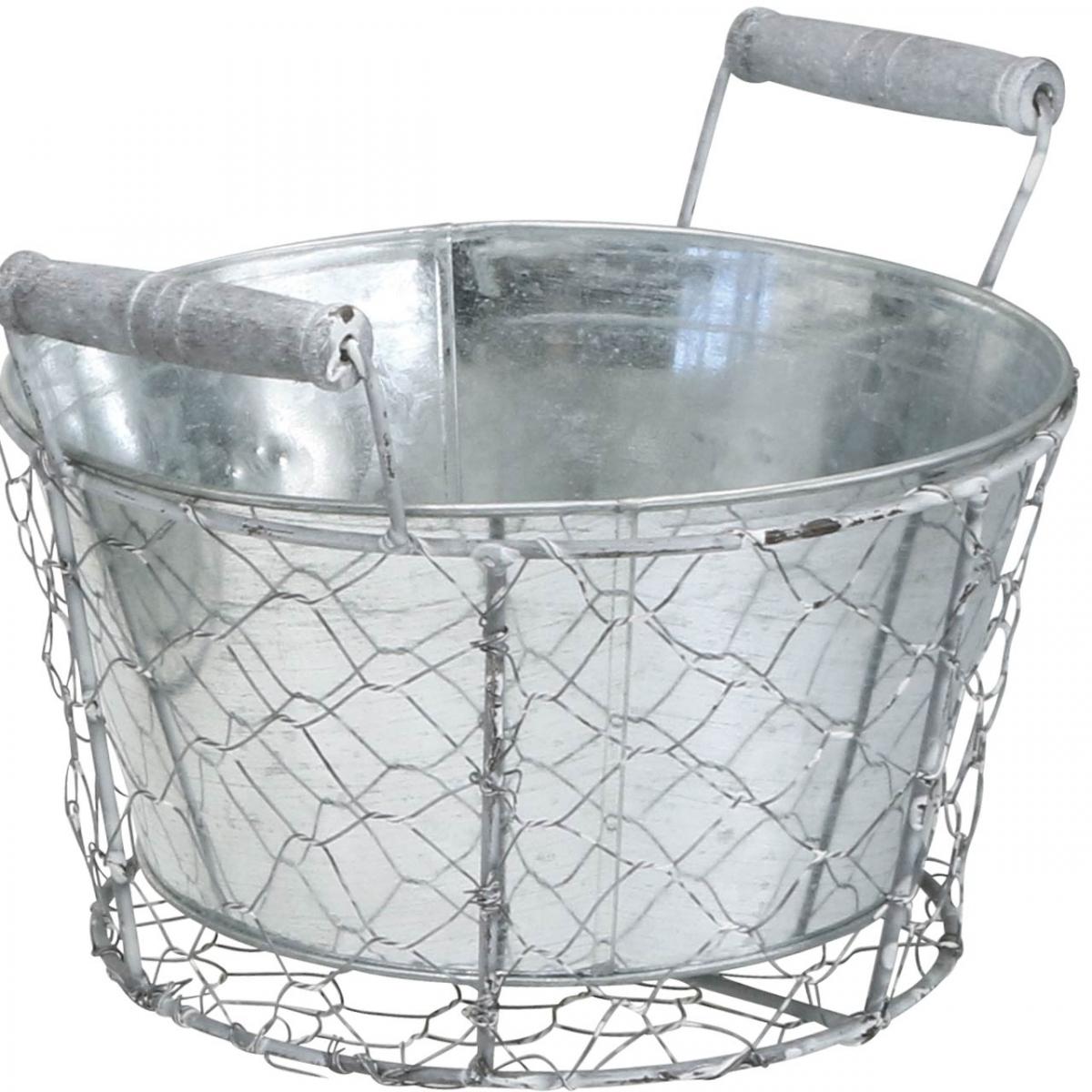Ültetőkosár betéttel, drótkosár, ültetőrugós ezüst, mosott fehér, kopott sikkes Ø22cm H17,5cm
