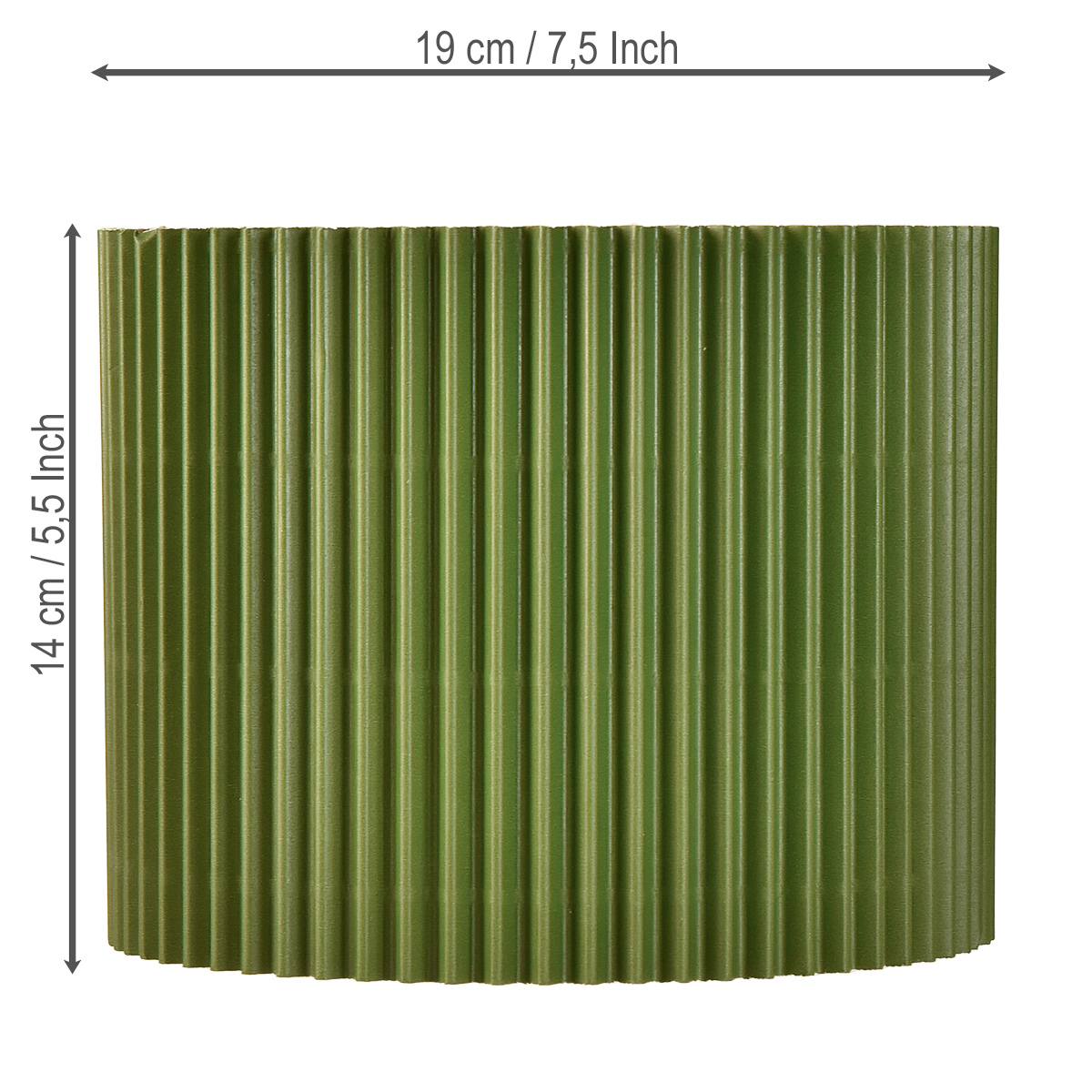 Ez az elegáns, sötétzöld papírkaspó dekoratív külsőt kölcsönöz bármely szobának. Körülbelül 19 cm átmérőjű és 14 cm magas virágcserép ideális közepes méretű növénykompozíciókhoz. A modern, bordázott külsővel rendelkező dizájn érdekes textúrát kölcsönöz neki. Ezáltal a kaspó ideális nappaliba, irodába vagy kreatív ajándékként. Kérjük, vegye figyelembe, hogy élő növényekkel való használat előtt a kaspót fóliával kell bélelni, hogy megvédjük a nedvességtől. A virágcserép tökéletes otthoni dísznövény-kompozíciókhoz, virágdíszekhez és kirakatokba.