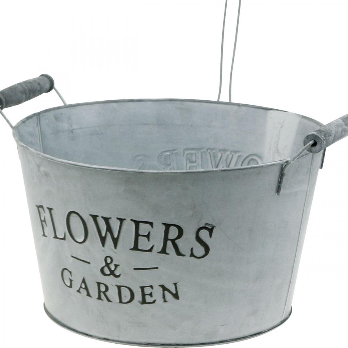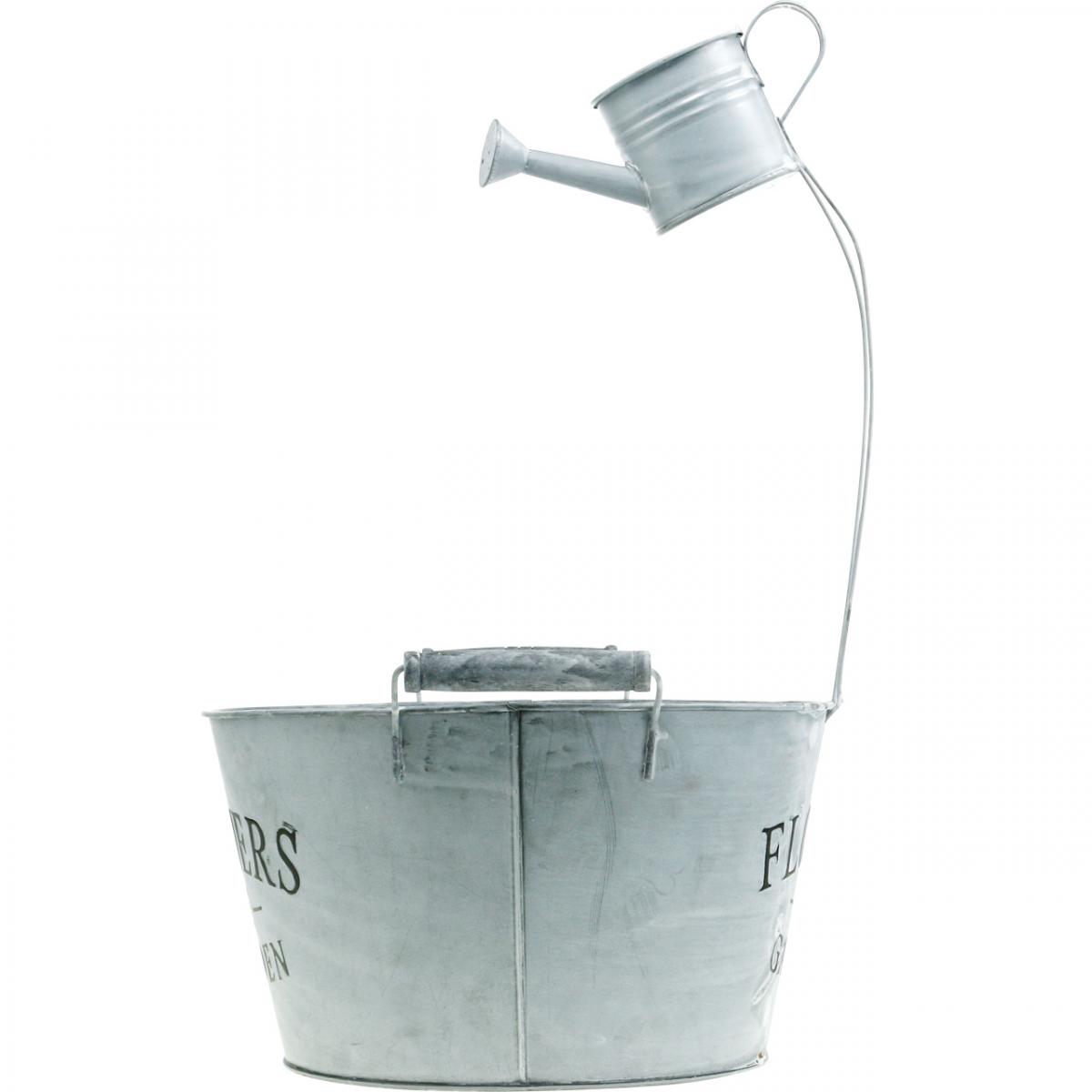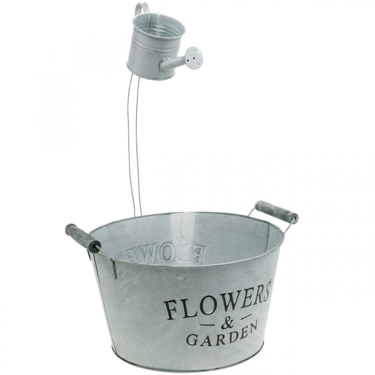 Ültetőtál öntözőkannával, kerti dekorációval, fém ültetőgép ültetéshez ezüst fehér mosott H41cm Ø28cm/Ø7cm