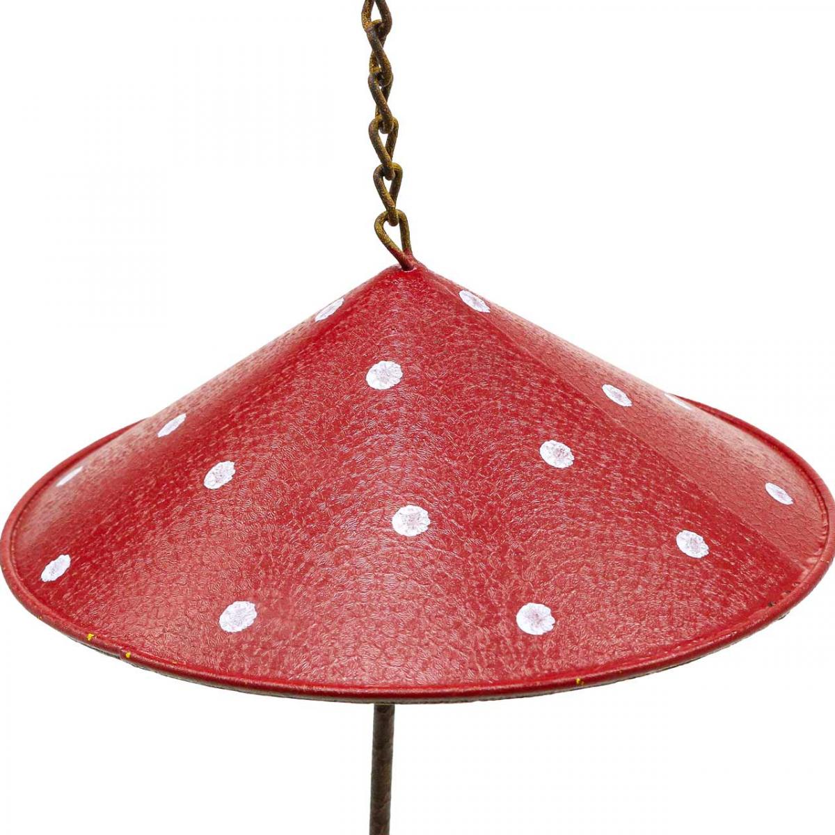 A gombagomba megjelenésében aranyosan pöttyös tető a madármagot is védi az esőtől és gyönyörű kerti díszt varázsol. A felfüggesztés és a lánc viszont a legszebb rozsdás megjelenésre festett.
