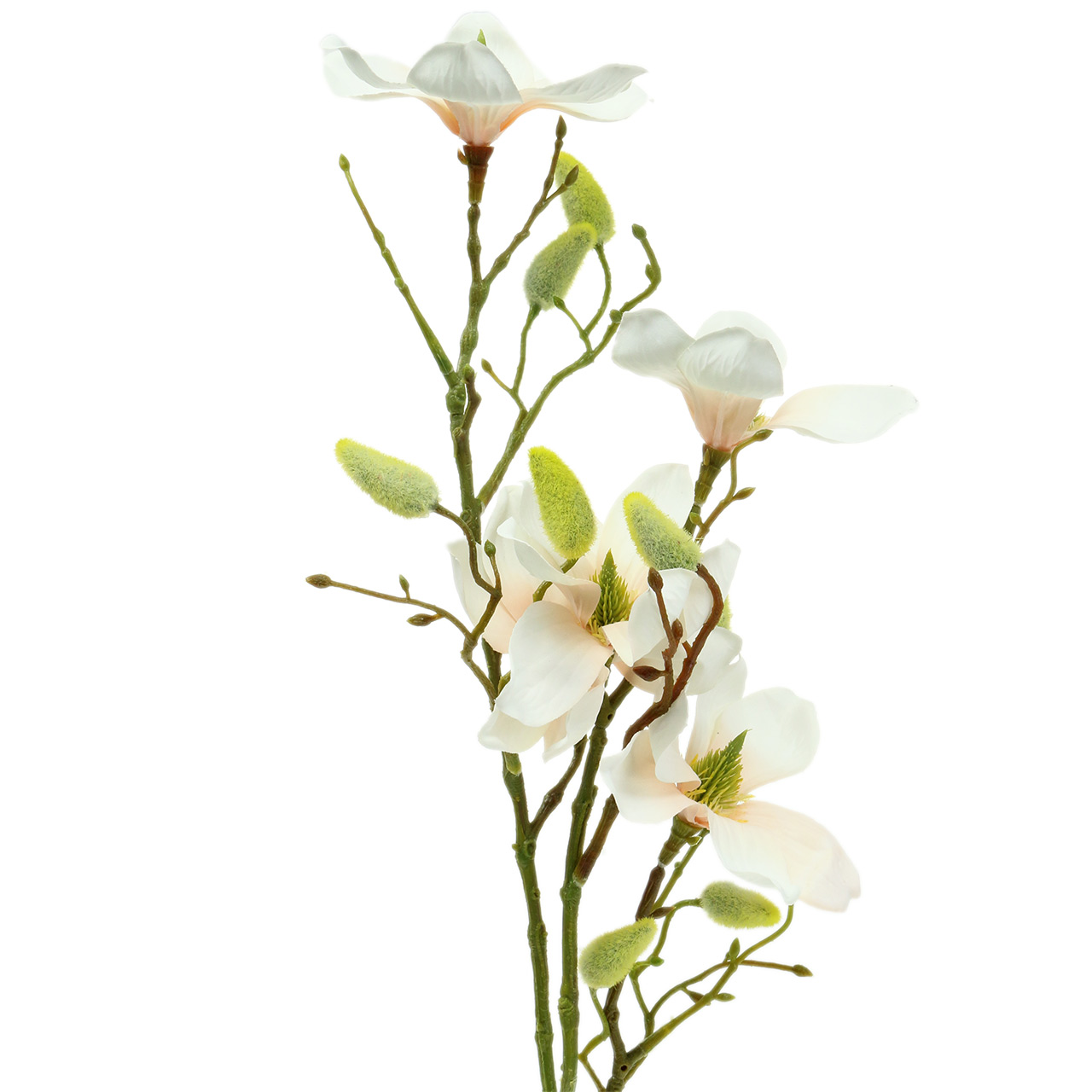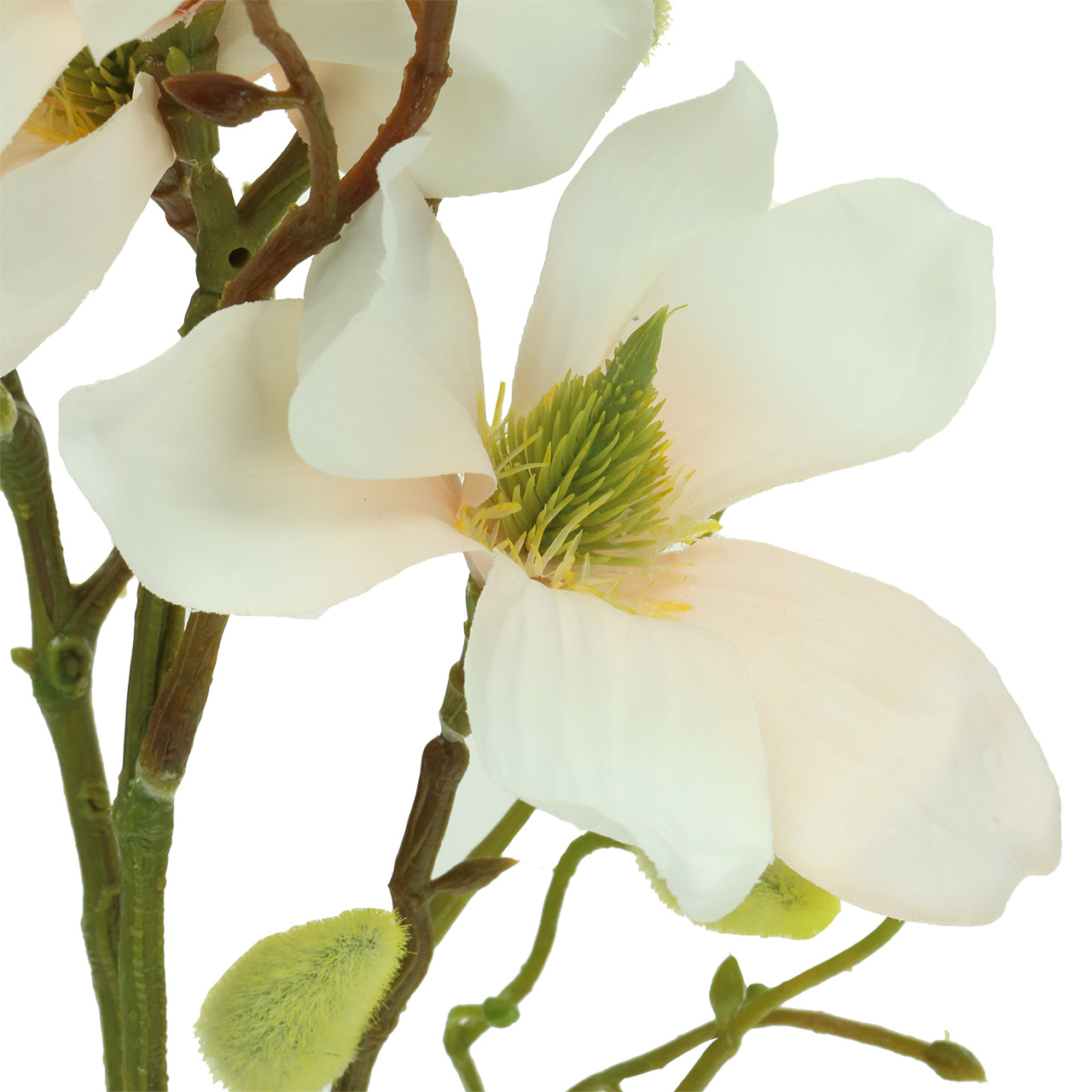 Az őszibarack színű mesterséges magnólia körülbelül 85 centiméter hosszú, a virágok átmérője körülbelül 10 centiméter. A fémből készült huzalmag megkönnyíti a feldolgozást.