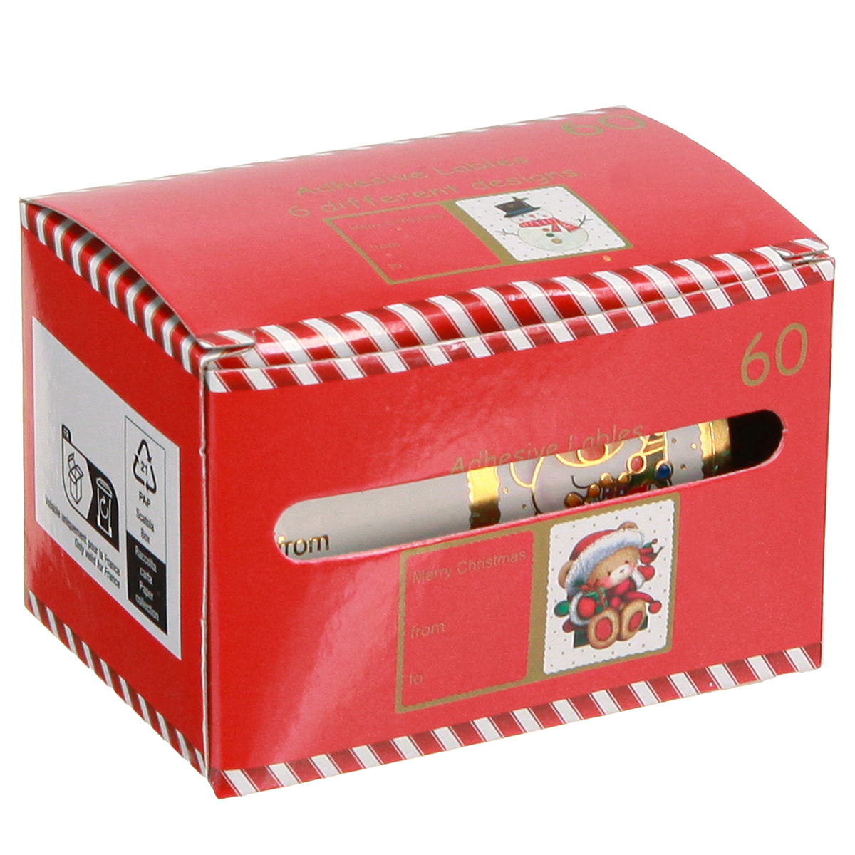 A praktikus 60-as tekercsben lévő karácsonyi címkéink körülbelül 5,5 cm × 3,3 cm méretűek. Sokoldalúak, és lenyűgöznek szeretettel megtervezett, vidám karácsonyi motívumaikkal. A gyertyáktól a mackókig – válaszd ki az ajándékodhoz megfelelő motívumot hat különböző dizájn közül. Az arany szegélyű címkék helyet biztosítanak az ajándékozó és a megajándékozott nevének, így minden ajándék személyre szabott.