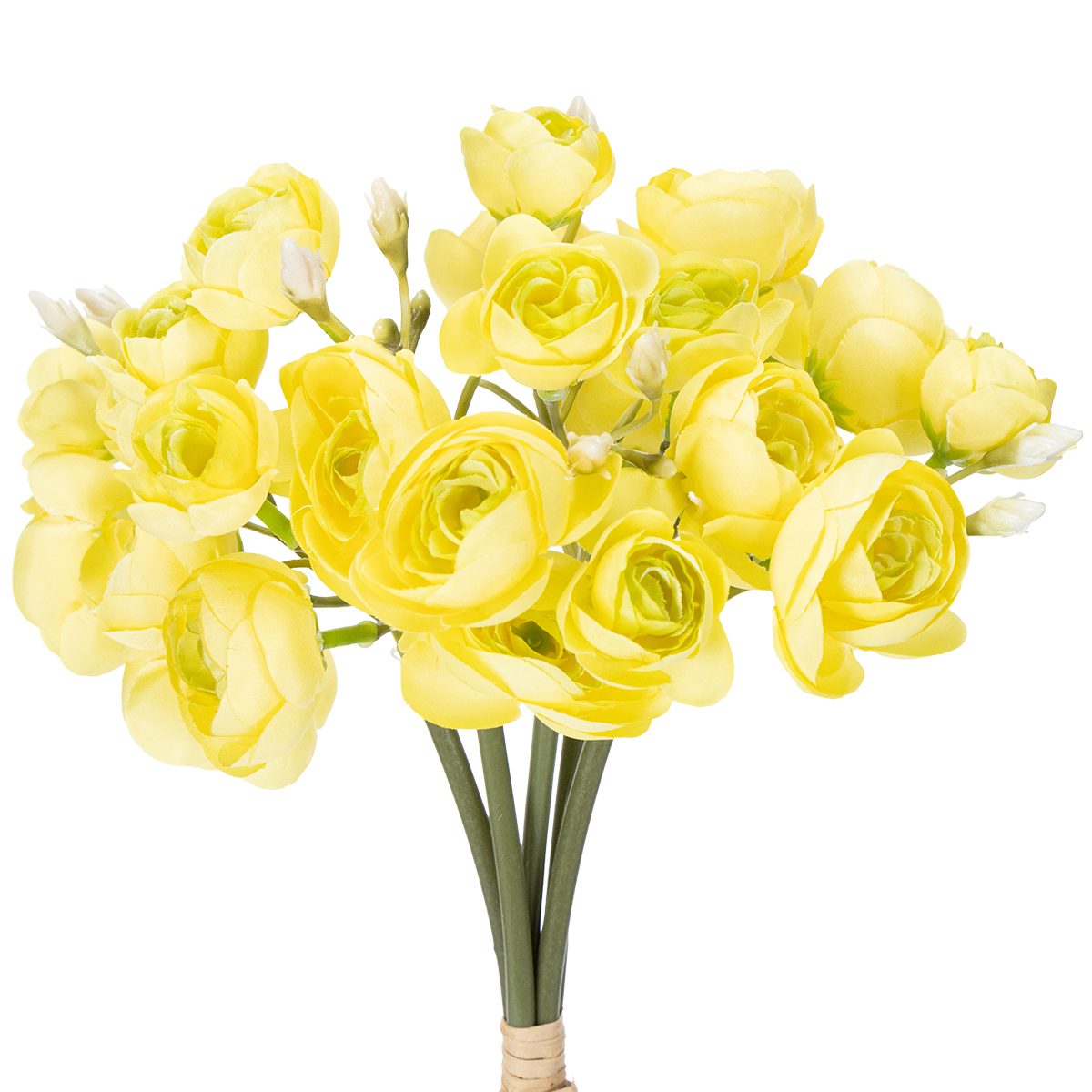 Egy csipetnyi tavasz, amikor csak szeretné: Ez a műboglárka csokor élénk sárga virágaival barátságos és hívogató hangulatot teremt otthonában. Gyakran érzi úgy, hogy az apró részletek sokkal otthonosabbá tehetik a szobát? Ezek a műboglárkák a tökéletes választás. Akár a nappali asztalának szemet gyönyörködtető központi díszeként, akár az ablakpárkányon lévő friss dekorációként, akár különleges alkalmakkor ünnepi kiegészítőként, ez a boglárka csokor könnyedén teremt könnyed és stílusos hangulatot. A legjobb az egészben, hogy nem kell aggódnia a karbantartás vagy a hervadás miatt. A kiváló minőségű poliészter és műanyag anyagoknak köszönhetően ez a csokor tartós szépséggel büszkélkedhet.