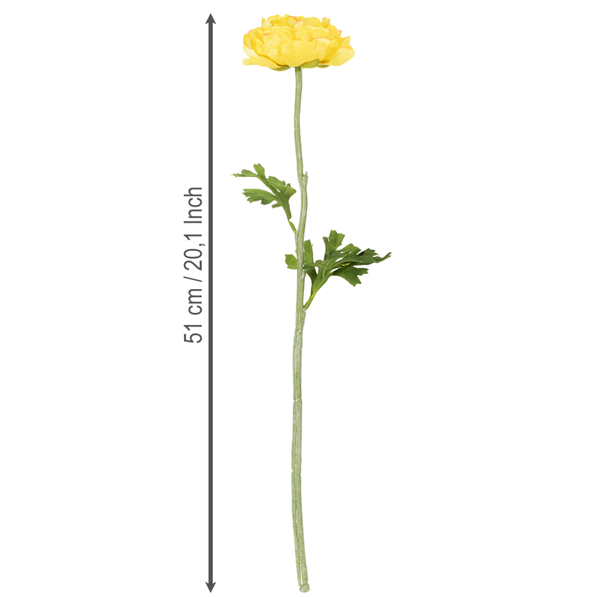 Ezek a boglárkák kiváló minőségű művirágokat hoznak otthonodba, amelyek nemcsak praktikusak, de esztétikusak is. Ezen díszvirágok minden egyes virágát aprólékos figyelemmel készítik: a finom szirmok rétegesek és élethűek, a buja zöld levelek pedig tökéletesen kiegészítik az élénk sárga árnyalatot. A tartós anyag biztosítja, hogy a virágok évekig úgy nézzenek ki, mint újkorukban, hervadás és fakulás nélkül.