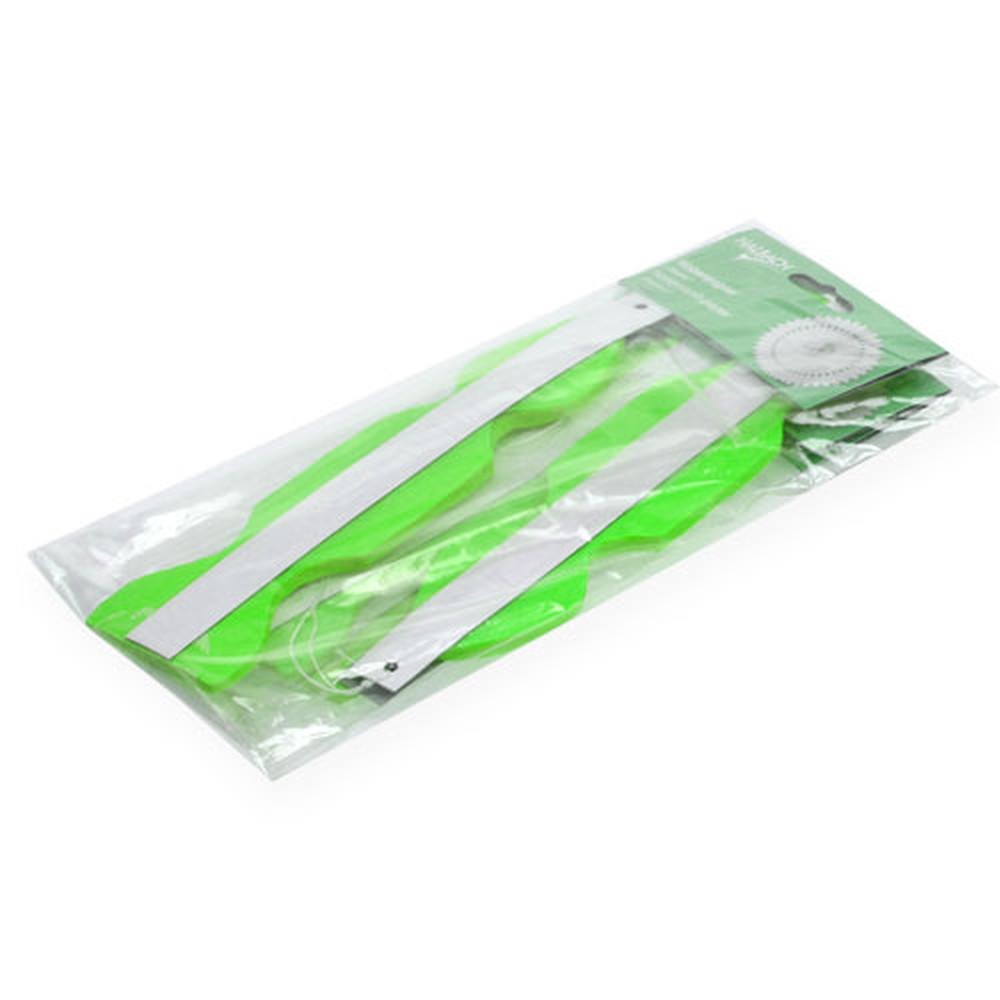 A méhsejtpapírból készült zöld dekoratív virágok 4 db-os készletben kaphatók, átmérőjük kibontva kb. 40 centiméter, a teljes hossza hurokkal együtt kb. 52 centiméter. Összecsukva a virágok körülbelül nyolc hüvelyk hosszúak.