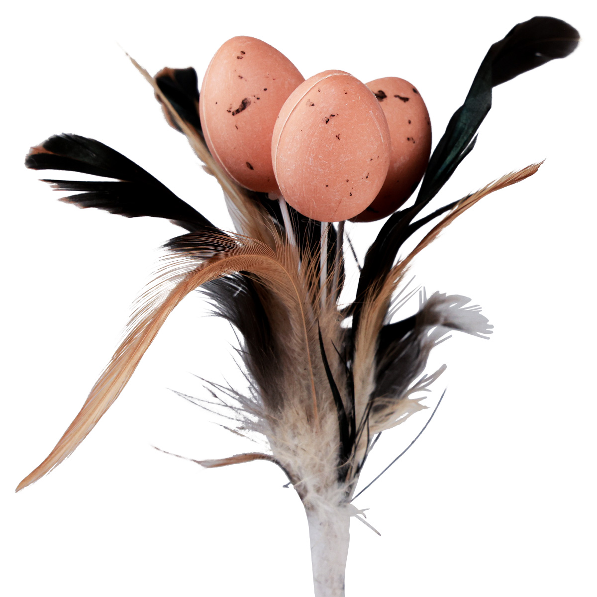 Műtojásaink pálcán egyesítik a természetes megjelenést a praktikus robusztussággal. A fürjtojás puha fehérjét a meleg barna árnyalatú fekete tollazat emeli ki, melyet a színben összehangolt fácántollak egészítenek ki. Akár egyenként, akár elrendezésben, ezek a mini húsvéti tojások sokoldalú dekorációs lehetőségeket kínálnak.