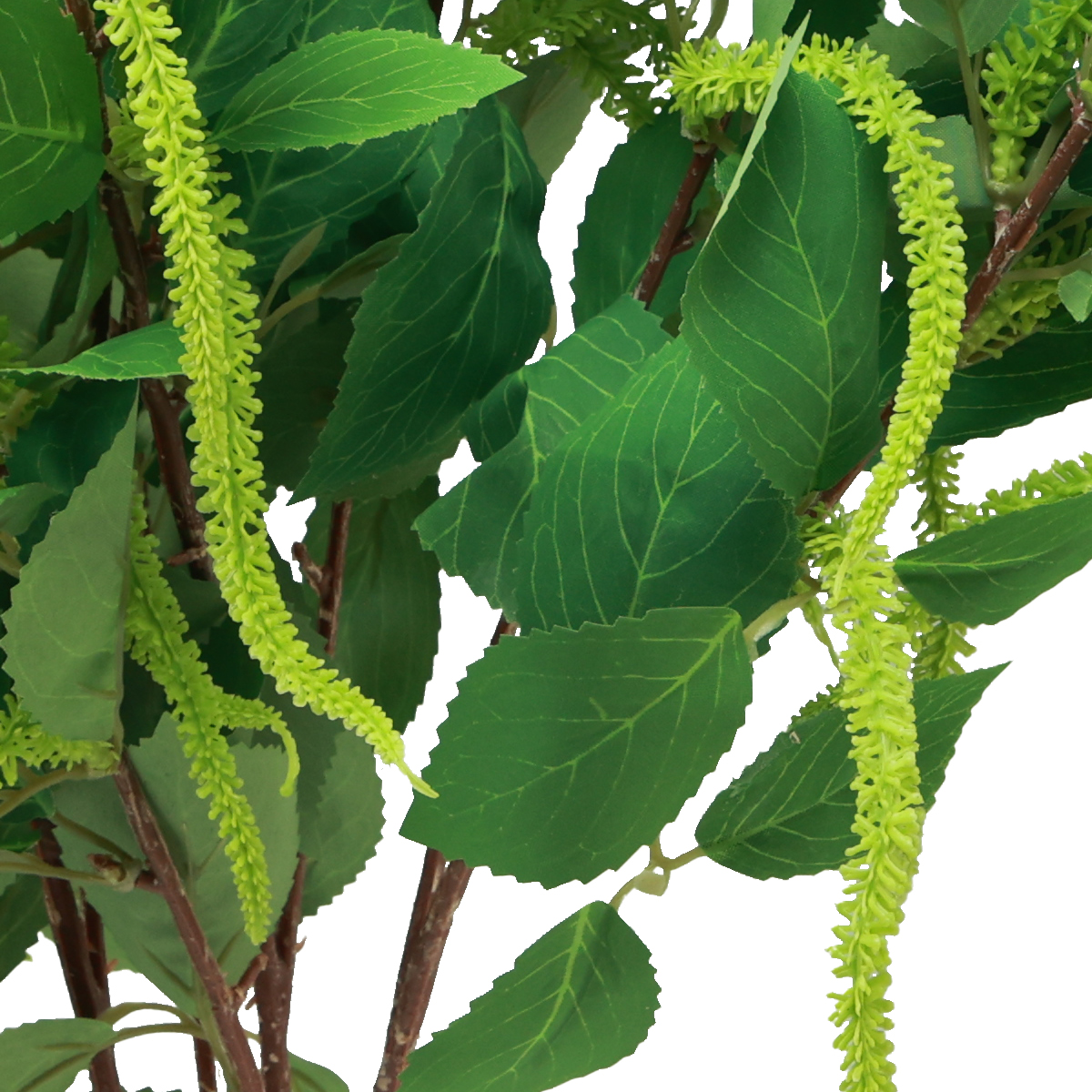 A nyírfaágak mindegyike különböző méretű levelekkel rendelkezik, és zöld nyírbarka teszi teljessé a műágak megjelenését.