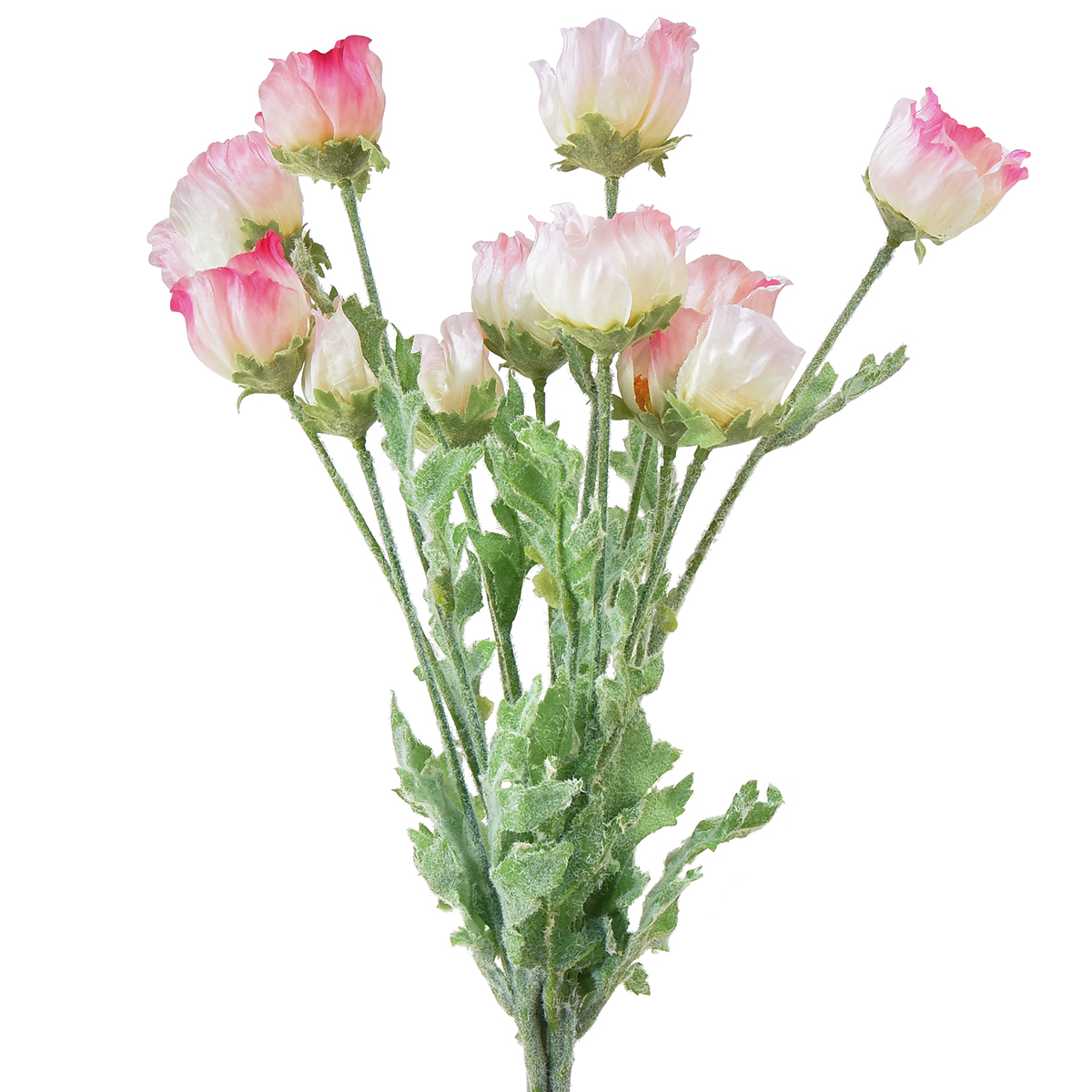 Négy zöld, bársonyosan puha bolyhos művirág szár mindegyike három különböző méretű műmák virággal van felszerelve. Két mák szárat kap művirágként fehér-rózsaszín és fehér-rózsaszín színben.