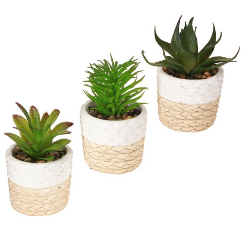 A pozsgás növények a legtrendibb növények, nem utolsósorban szokatlan növekedési formáik miatt igazán lenyűgöző természettel bírnak. Ezzel a mesterséges pozsgások hármasával most különösen jó minőségű és könnyen kezelhető példányokat adhat belső dekorációjához. A műnövények élethűek és részletgazdagok, és egy tetszetős, kosaras megjelenésű, díszkövekkel díszített kerámia edénybe ültetik őket.