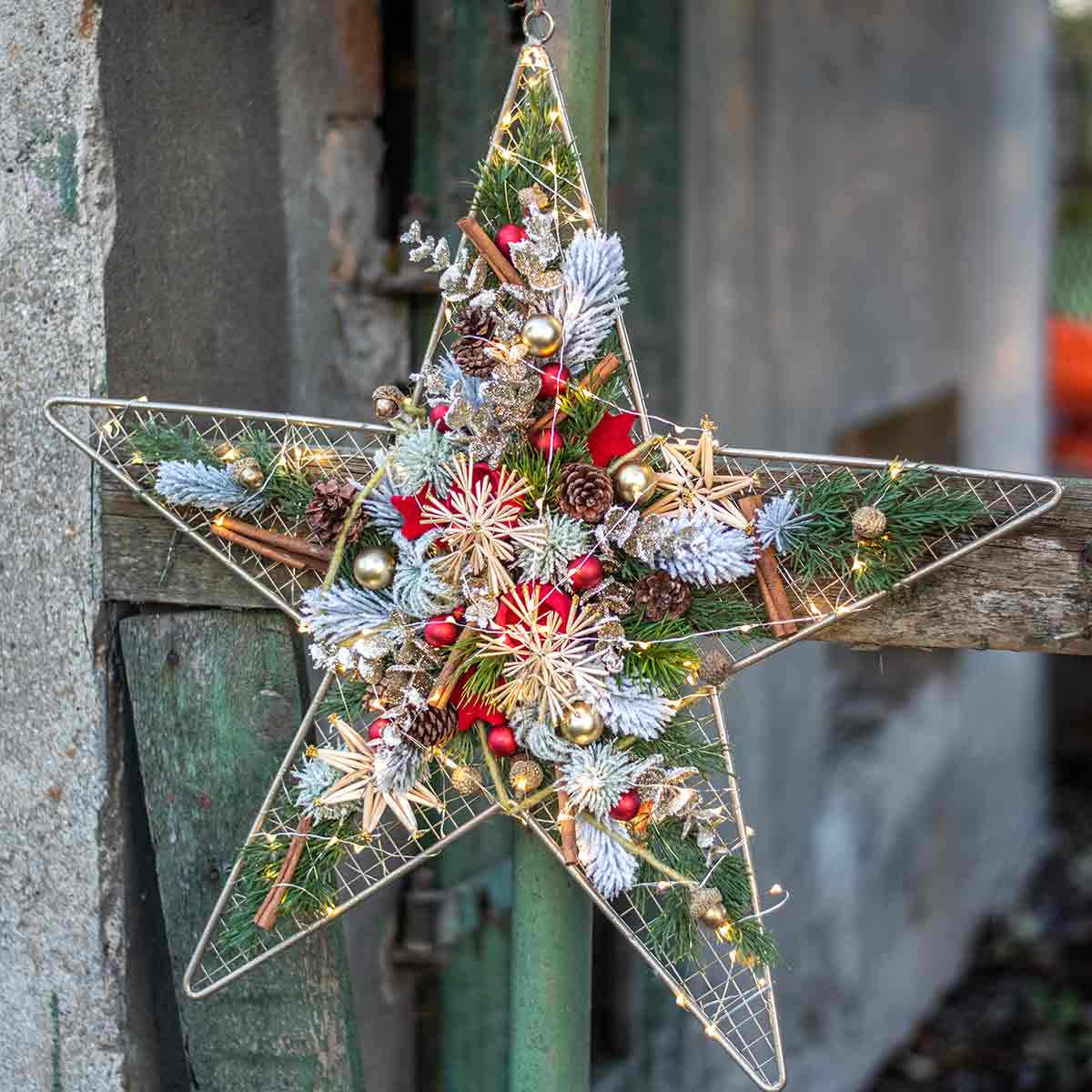 Ezzel a nagy fémcsillaggal megformázhatod saját dekoratív csillagodat. A rácscsillag hálói körülbelül 1,2 centiméteresek. Ez lehetővé teszi mesterséges növények, szárított virágok vagy sokféle szalag húzását és rögzítését.