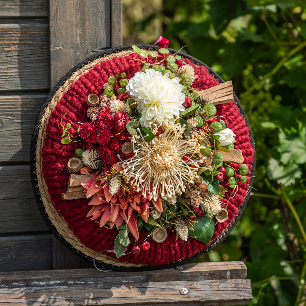 A sötétvörös "Flausch Mirabell" filczsinór körülbelül 25 centiméter hosszú, és praktikus táskában van. A gyapjú nagyon puha, és viasszal is formában tartható, például ha művészi és kifinomult mintákat szeretne létrehozni.
