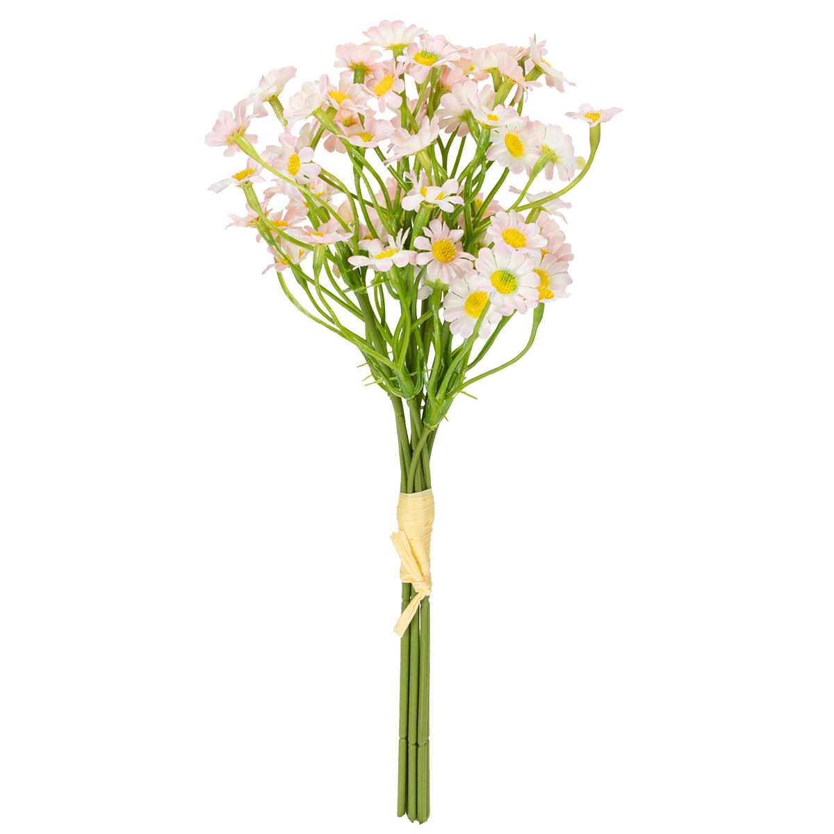 Műkamillás csokrunkunk a minőséget ötvözi a dizájnnal. A aprólékosan kidolgozott virágok kiváló minőségű selyemanyagból készültek, ami figyelemre méltóan realisztikus megjelenést kölcsönöz nekik. Az élénk fehér, finom rózsaszín és friss zöld kombinációja ideális könnyed belső stílusokhoz, például vidéki vagy skandináv stílushoz. 28 cm magas és 12 cm átmérőjű csokor elég kompakt ahhoz, hogy különféle helyszíneken elhelyezhető legyen – legyen szó akár a komódról, a vendégszobáról vagy a munkahelyről. A csokor sokoldalúsága különösen vonzó. A könnyen kezelhető anyagnak köszönhetően sokáig szép marad anélkül, hogy öntözni vagy a hervadt leveleket eltávolítani kellene. Egyszerűen helyezze egy vázába, és azonnal kellemes hangulatot teremt bármely helyiségben. Természetesebb megjelenésért a csokrot más művirágokkal, például százszorszépekkel vagy levendulával kombinálhatja. Az eredmény? Egy harmonikus dekoráció, amely bármilyen teret feldob.