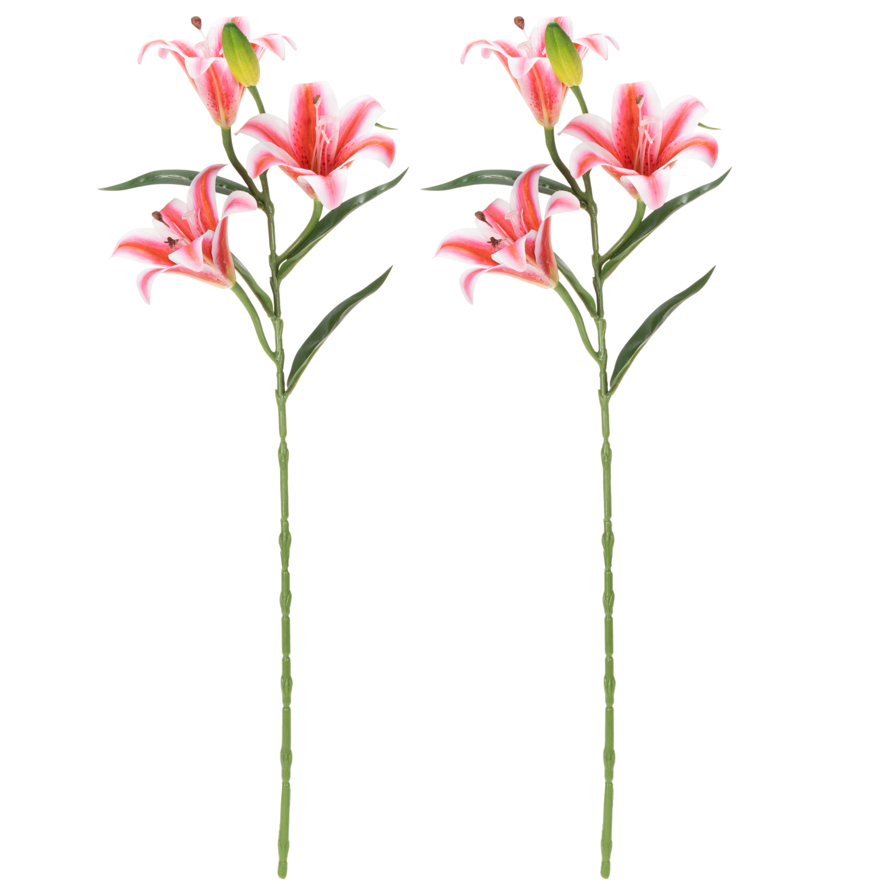 Ezeknek a műliliomoknak a aprólékos kidolgozása még a legigényesebb szemet is lenyűgözi. A finom rózsaszín szirmok finom színátmenetükkel és valósághű porzóikkal természetes megjelenést kölcsönöznek, amely elkápráztatja vendégeit. A nagy, 67 cm magas liliomszárak ideálisak magas vázákba, míg a filigrán levelek könnyedséget és eleganciát kölcsönöznek a dizájnnak.