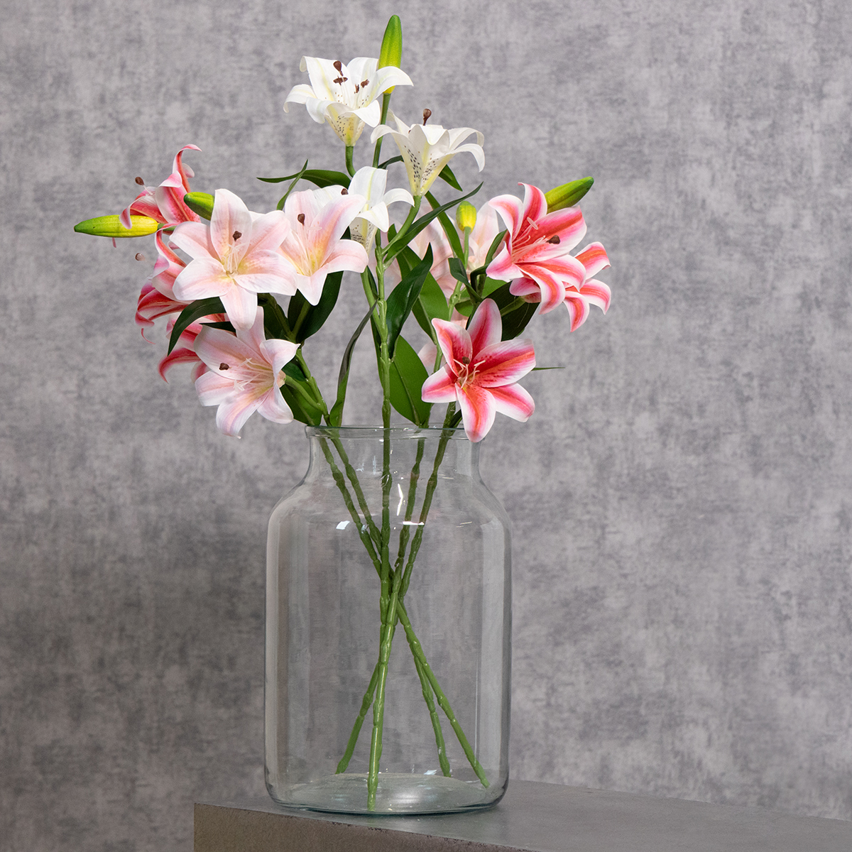 Ezeknek a műliliomoknak a aprólékos kidolgozása még a legigényesebb szemet is lenyűgözi. A finom rózsaszín szirmok finom színátmenetükkel és valósághű porzóikkal természetes megjelenést kölcsönöznek, amely elkápráztatja vendégeit. A nagy, 67 cm magas liliomszárak ideálisak magas vázákba, míg a filigrán levelek könnyedséget és eleganciát kölcsönöznek a dizájnnak.