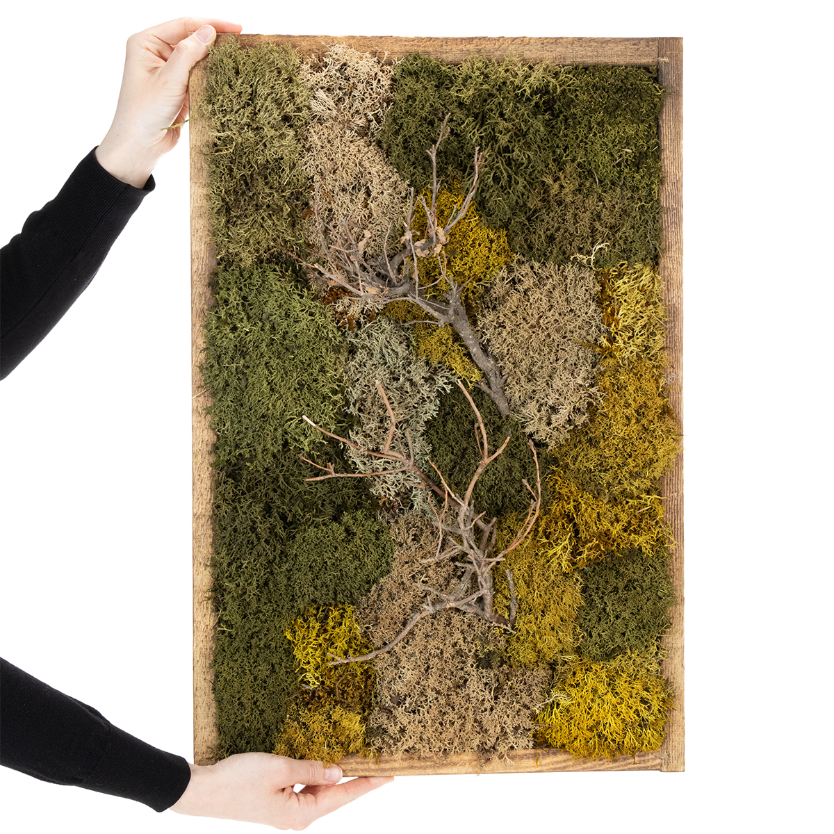Ez a kiváló minőségű moha műalkotás igazi szemet gyönyörködtető minden falra. A különböző mohák és természetes ágak finoman összehangolt összetétele minden helyiségnek különleges hangulatot kölcsönöz. A nyugtató zöld tónusok és a moha autentikus textúrája nyugodt és kényelmes légkört teremt – tökéletes várótermekbe, irodákba vagy akár otthon is.