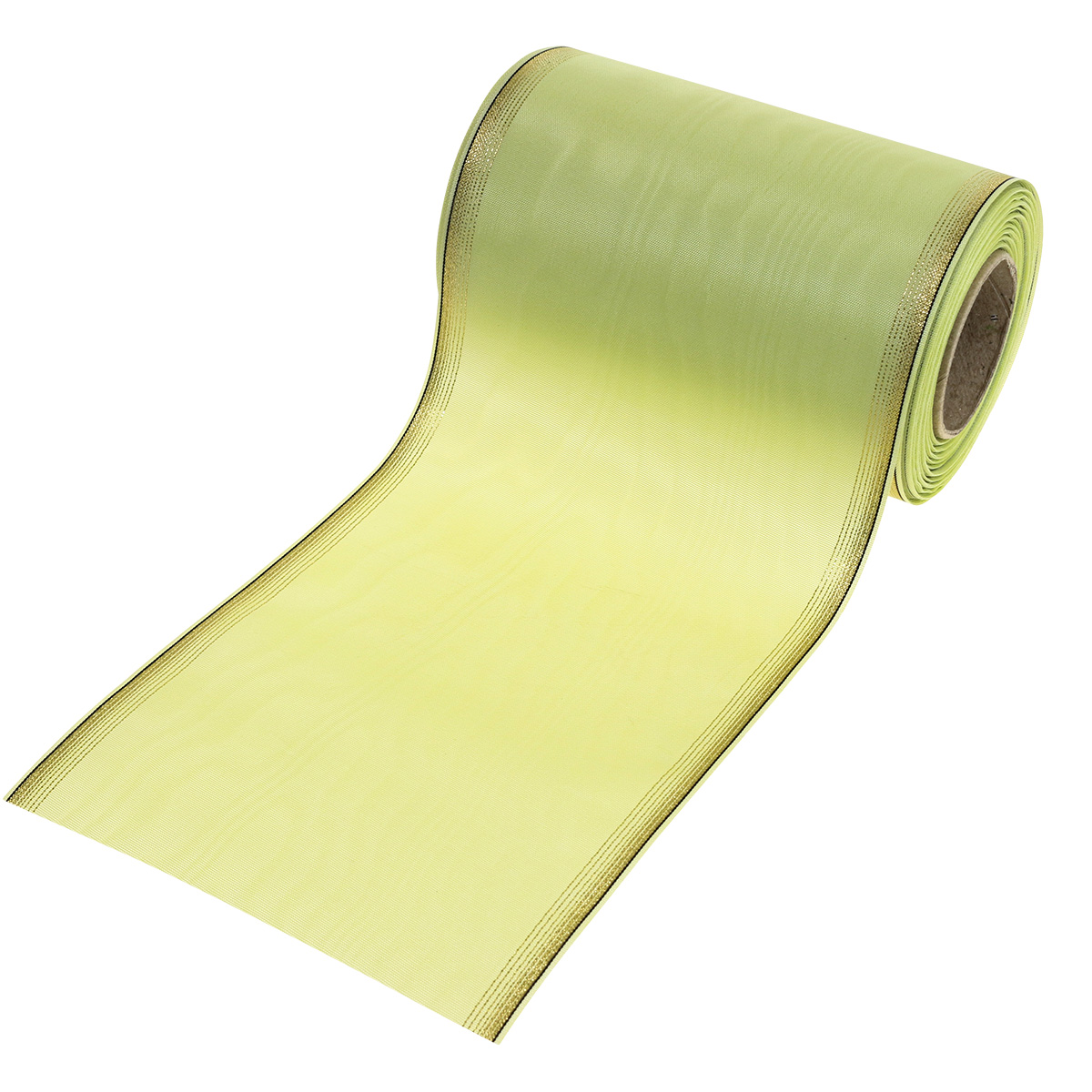 Moiré koszorú szalag 150mm 25m világoszöld színben arany szegéllyel virágkötészethez és dekorációhoz