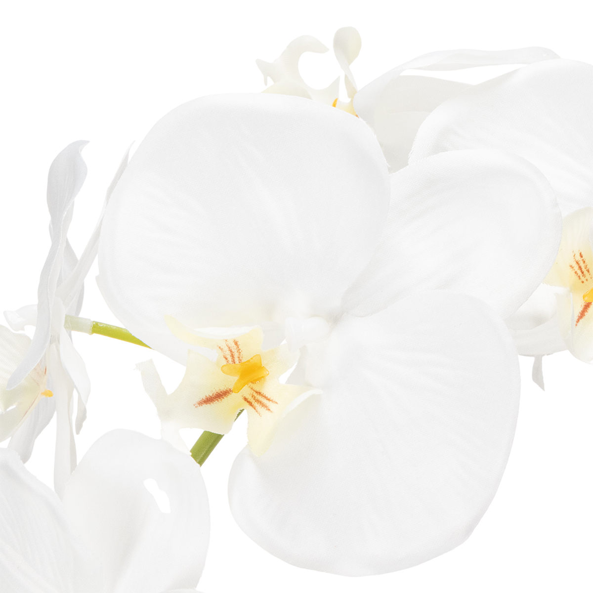 Az orchideák mindig is az eleganciát, a kecsességet és az egzotikus szépséget jelképezték. A fehér szín a tisztaságot, a békét és a tökéletességet jelképezi. Egy ilyen műorchidea nemcsak időtlen esztétikát kölcsönöz a szobának, hanem az egyensúly és a harmónia érzetét is közvetíti. Ezért tökéletes arra, hogy finoman gazdagítsuk a nappali vagy a munkahelyi tereket a nyugalom és a tisztaság üzenetével.