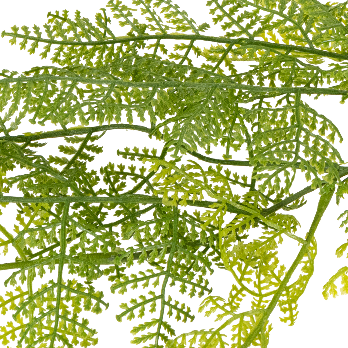 A műpáfrány függőnövény sokkal több, mint egy dísztárgy. Bármely helyiséget feldobhat, a nappalitól és a fürdőszobától kezdve a védett kültéri területekig, mint például az erkélyek vagy fedett teraszokig. A nappaliban élénk frissességet hoz; a fürdőszobában vonzó kontrasztot alkot az egyszerű csempékkel; az irodában pedig harmonikus munkakörnyezetet teremt. Megtévesztően realisztikus megjelenésének köszönhetően ez a műnövény úgy néz ki, mintha frissen a természetből származna – teljesen könnyedén.