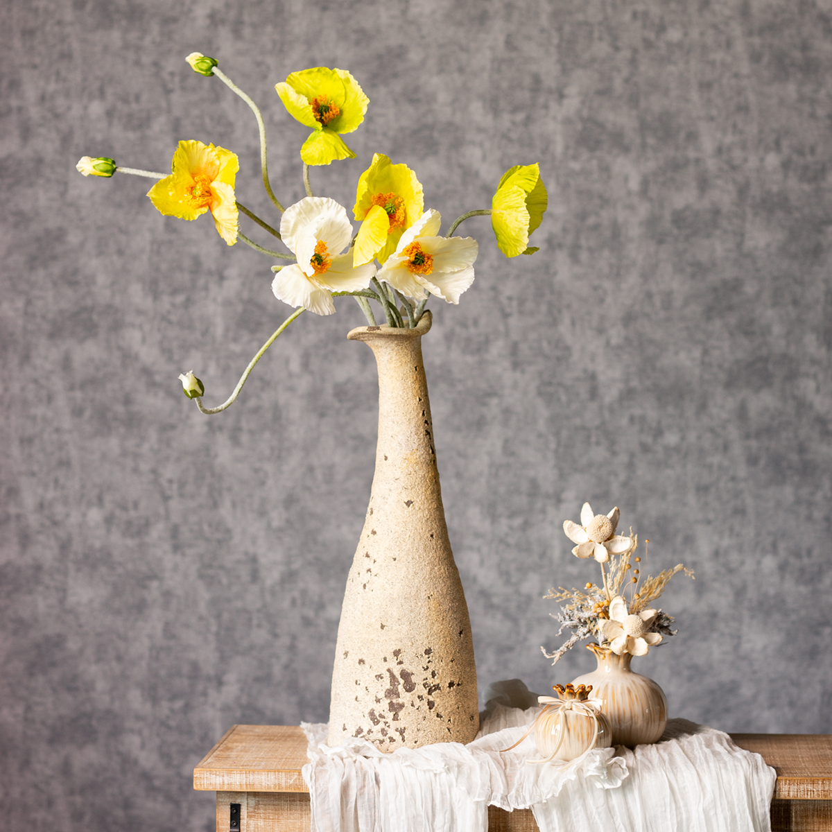 Ez a 95 cm magas műpipacs csokor feltűnő látványt nyújt bármely szobában. Az élénk sárga virágok, a természetes formákkal és a kecsesen ívelt szárakkal kombinálva stílusos és modern jelleget kölcsönöznek ennek a kompozíciónak. Ideális a modern belsőépítészet, a skandináv stílus vagy a városi dzsungel stílus kedvelőinek. A 30 cm átmérőjű és 95 cm magas, három szárból álló szett rengeteg lehetőséget kínál a különféle dekorációs ötletekhez. Akár egyenként egy egyszerű vázában rendezve, akár más művirágokkal kombinálva egy buja csokrot hoz létre – a lehetőségek végtelenek! A pipacsok különösen jól harmonizálnak a fehér vagy zöld díszítésekkel. A poliészter és a műanyag kombinációja tartósságot biztosít, és a virágoknak és leveleknek hihetetlenül realisztikus megjelenést kölcsönöz. Tökéletes azok számára, akik értékelik a természetes érzetet, de nem akarnak kompromisszumot kötni a tartós frissesség terén. És nincs fárasztó karbantartás? Erről elfeledkezhet!