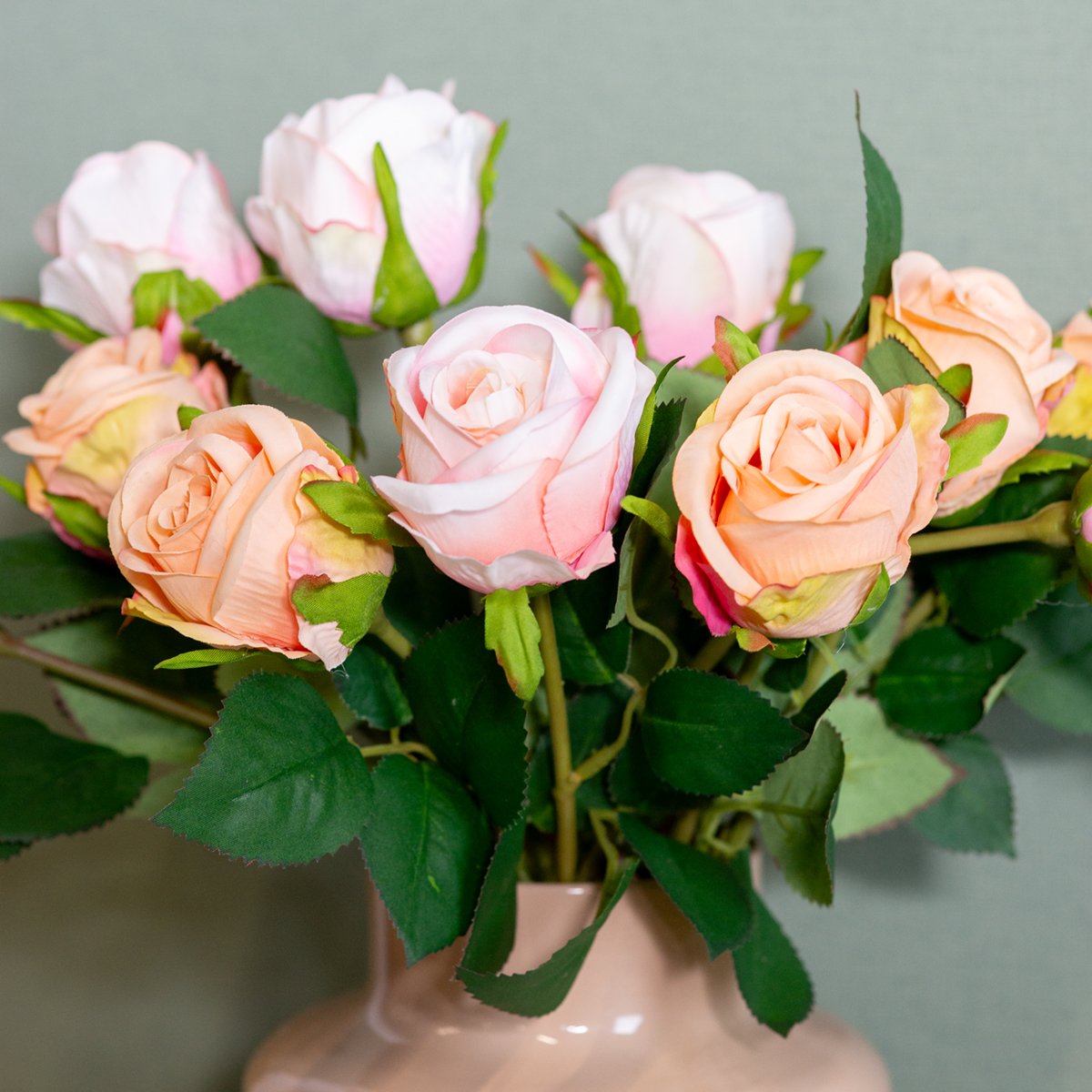 Szereted a rózsák varázsát, de szeretnéd elkerülni a gondozásukkal járó nyűgöket? Semmi gond! Műrózsa-csokrunkkal a virágok királynőjének időtlen szépségét közvetlenül otthonodba varázsolhatod. Tökéletes mindazok számára, akik értékelik az elegáns dekorációt friss virágok nélkül. Akár a nappali fénypontjaként, akár bájos asztaldíszként különleges alkalmakra, vagy stílusos ajándékként – ez a rózsacsokor különleges hangulatot kölcsönöz bármely helyiségnek. A finom rózsaszín selyemvirágok a zöld levelekkel kombinálva annyira hihetetlenül realisztikusnak tűnnek, hogy szinte el is felejtheted, hogy művirágok. A vendégeid el lesznek ámulva!