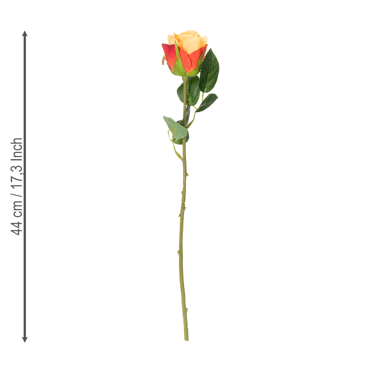 Ez a hat narancssárga virágból álló műrózsa-kompozíció igazi mindenes az otthoni dekoráció világában. 44 cm magas, így különösen elegánsan mutat magas vázákban. A kiváló minőségű poliészter és műanyag felhasználásával készült aprólékos kidolgozás természetes megjelenést kölcsönöz a rózsáknak, amely még közelről is meggyőző. A virágok meleg narancssárga árnyalatai könnyedséget és ragyogást visznek a szobákba, míg a zöld levelek természetközeli hangulatot kölcsönöznek. Akár a nappali dekorációját szeretné felfrissíteni, akár az étkezőasztalára keres stílusos kiegészítőt – ez a csokor tökéletesen illik hozzád.