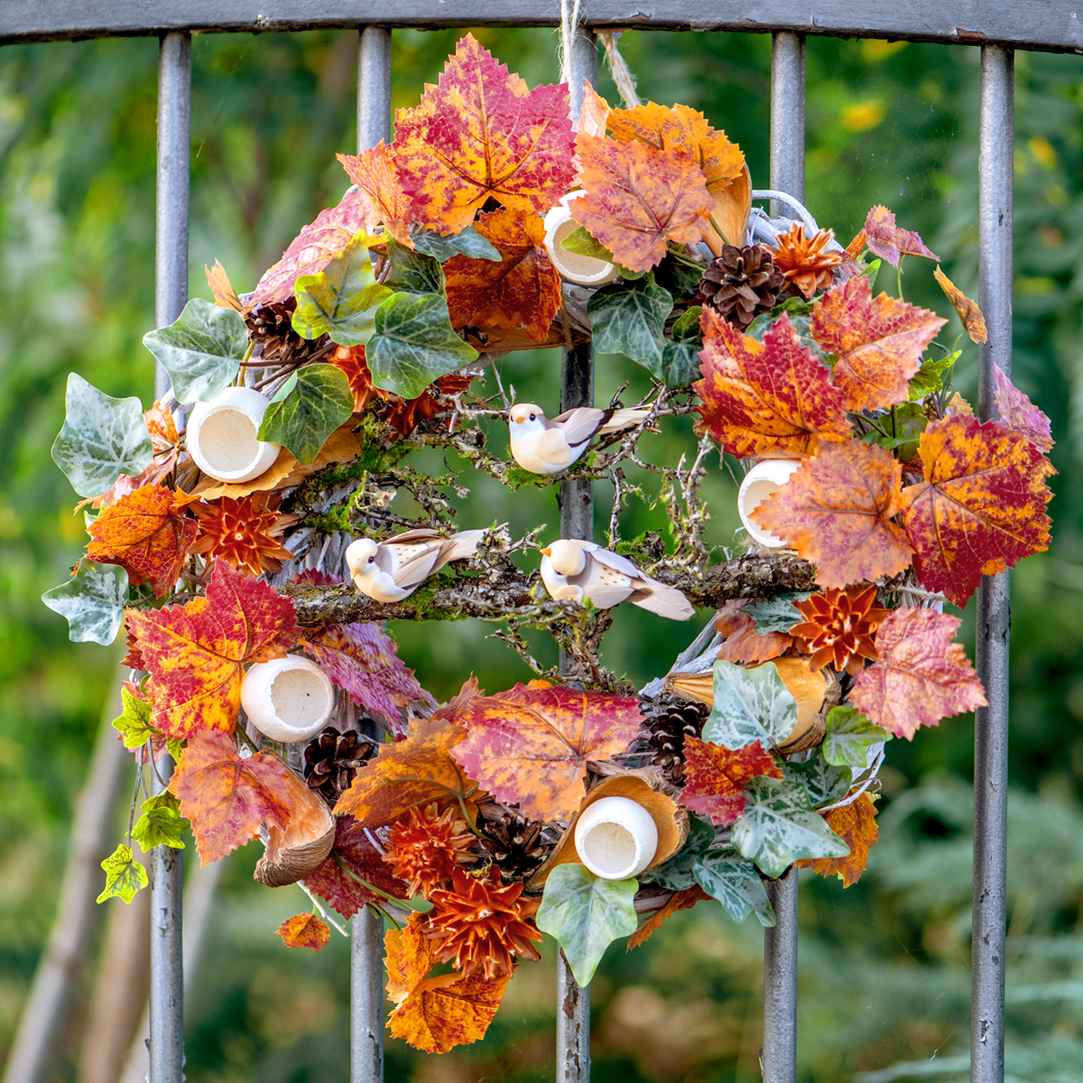 Hagyja, hogy a műnövény lógjon le a falról vagy a mennyezetről őszi dekorációként. Természetesen a sok ágú műszőlőlevelek is rakhatók. Pillanatok alatt megtervezhetett egy kirakatot az őszi dekorációval, vagy díszített egy étkezőt őszi színekkel.